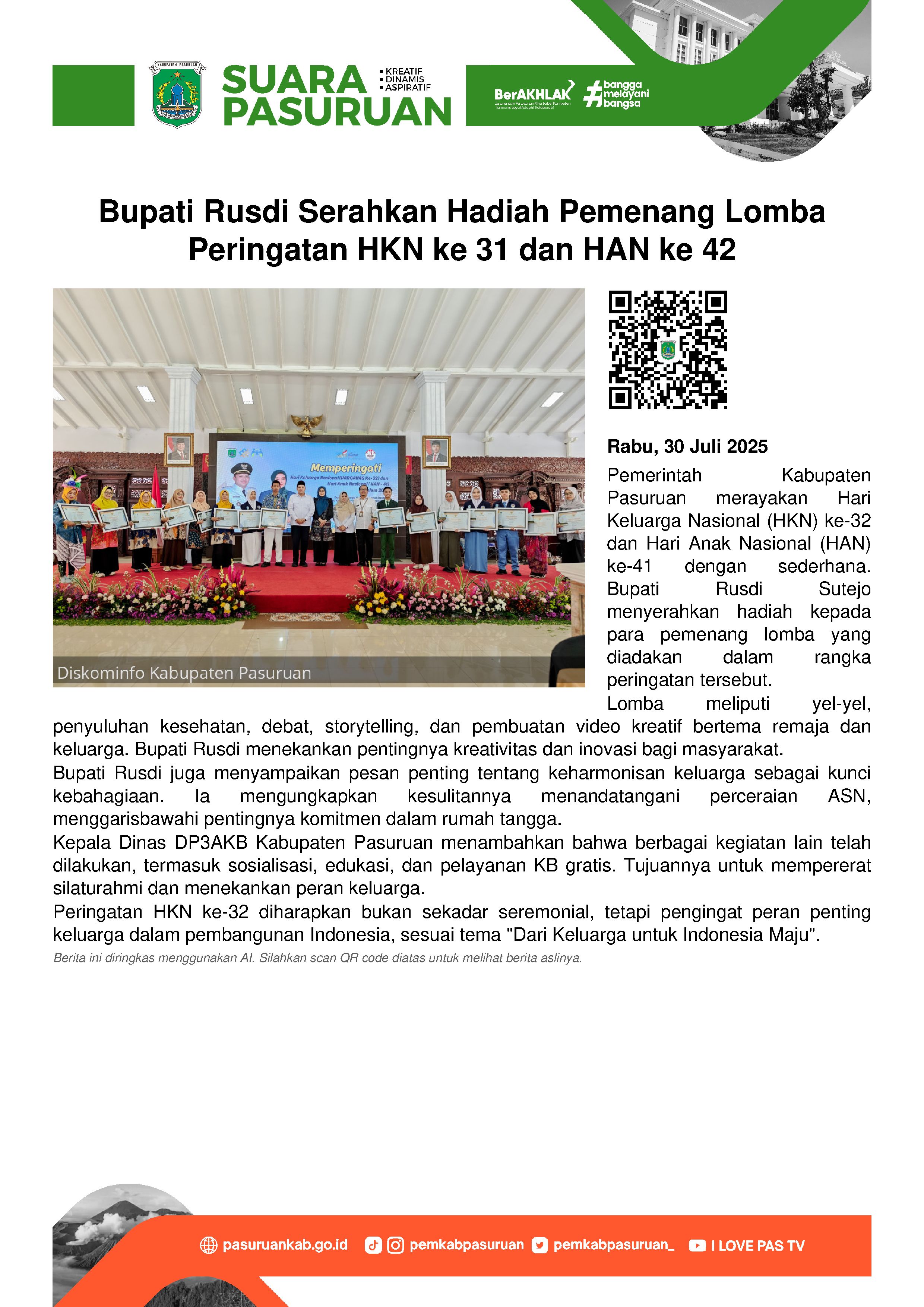 Pemerintah Kabupaten Pasuruan menggelar Puncak Peringatan Hari Keluarga Nasional (HKN) ke-32 dan Hari Anak Nasional (HAN) ke-41 dengan cara yang sederhana.