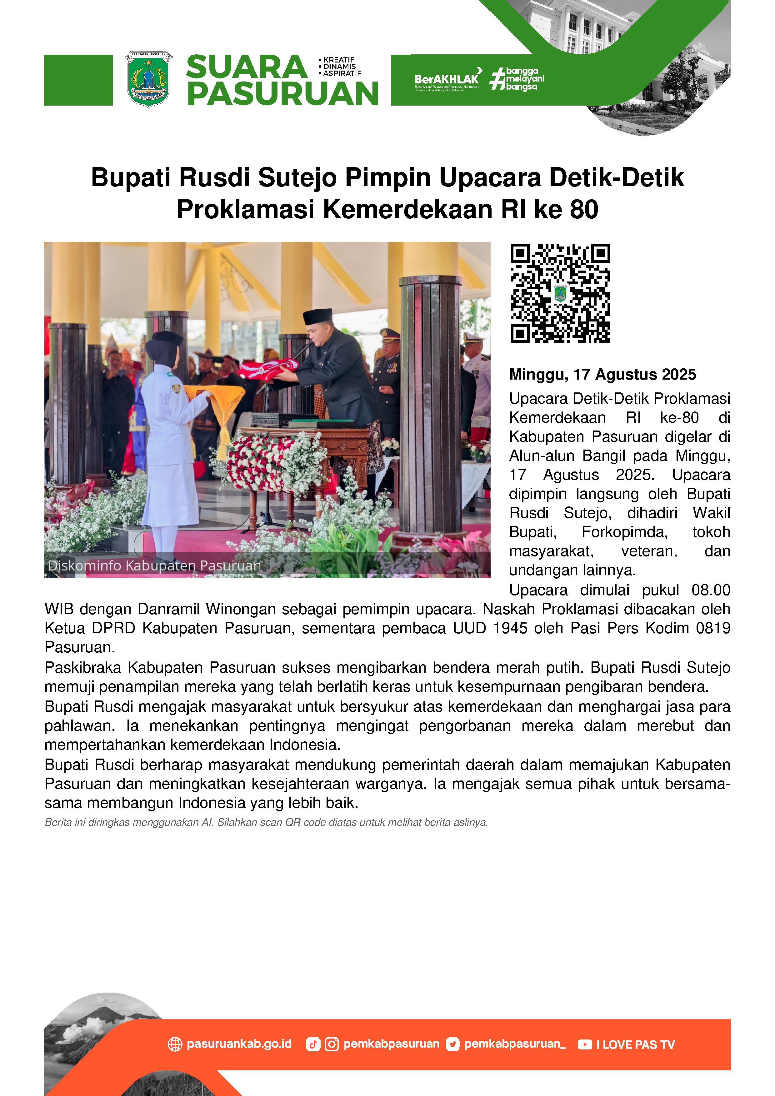 Perihal HUT Kemerdekaan RI ke 80, Mas Rusdi - sapaan akrab Bupati Pasuruan ini mengajak seluruh lapisan masyarakat agar senantiasa bersyukur. Lantaran kemerdekaan yang diraih bangsa Indonesia sejak tahun 1945 semata-mata hasil perjuangan pantang menyerah dari para pahlawan hingga mengorbankan jiwa dan raganya.