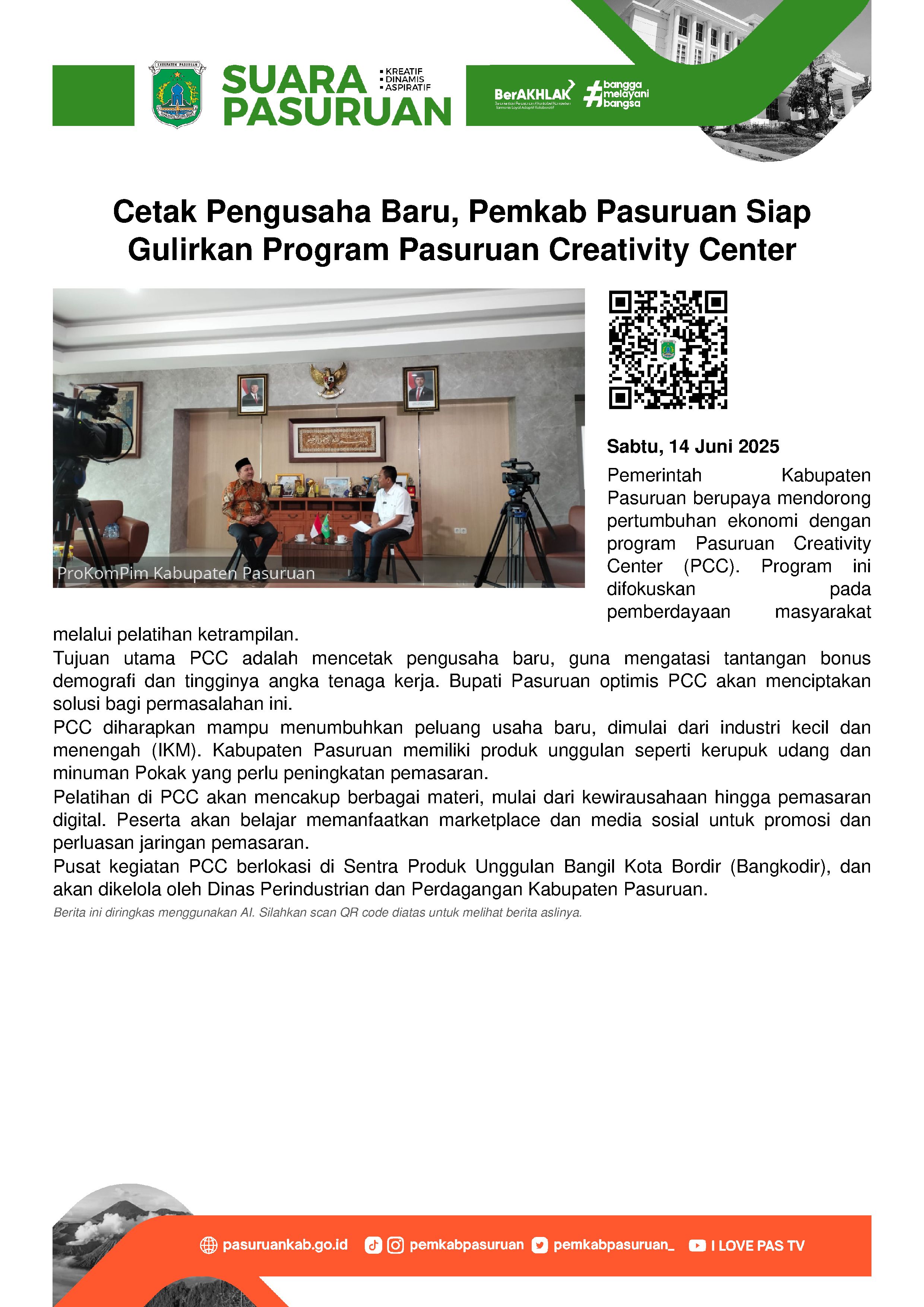 program Pasuruan Creativity Center. Tujuannya untuk membantu masyarakat menjadi