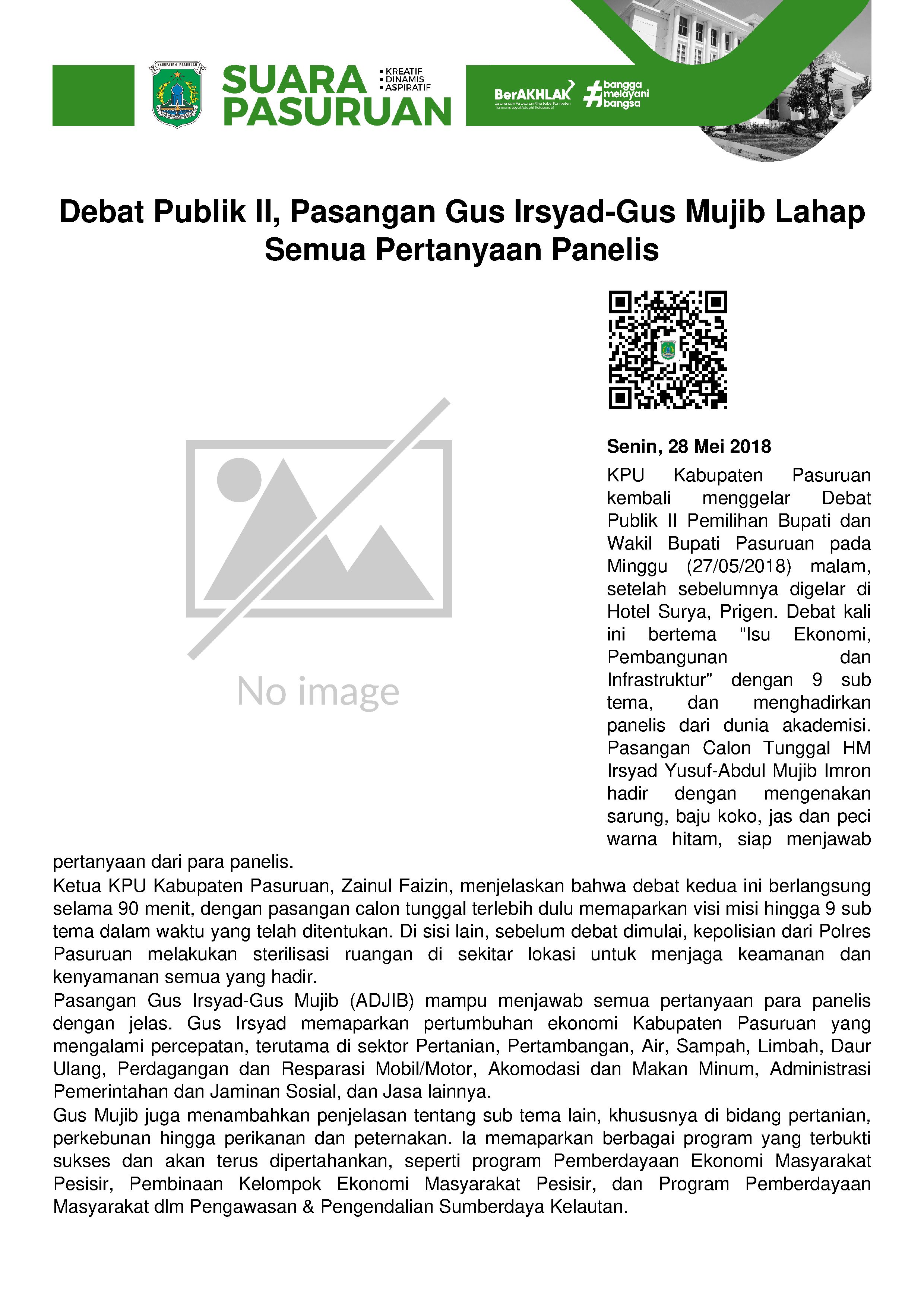 Sementara itu, dari semua sub tema yang dibahas dalam debat kedua, Pasangan Gus Irsyad-Gus Mujib (ADJIB) mampu menjawab semua pertanyaan para panelis dengan jelas. Salah satu contoh penjelasan tentang pertumbuhan ekonomi, di mana Gus Irsyad menyampaikan dengan gamblang, di hadapan ratusan undangan yang hadir.
