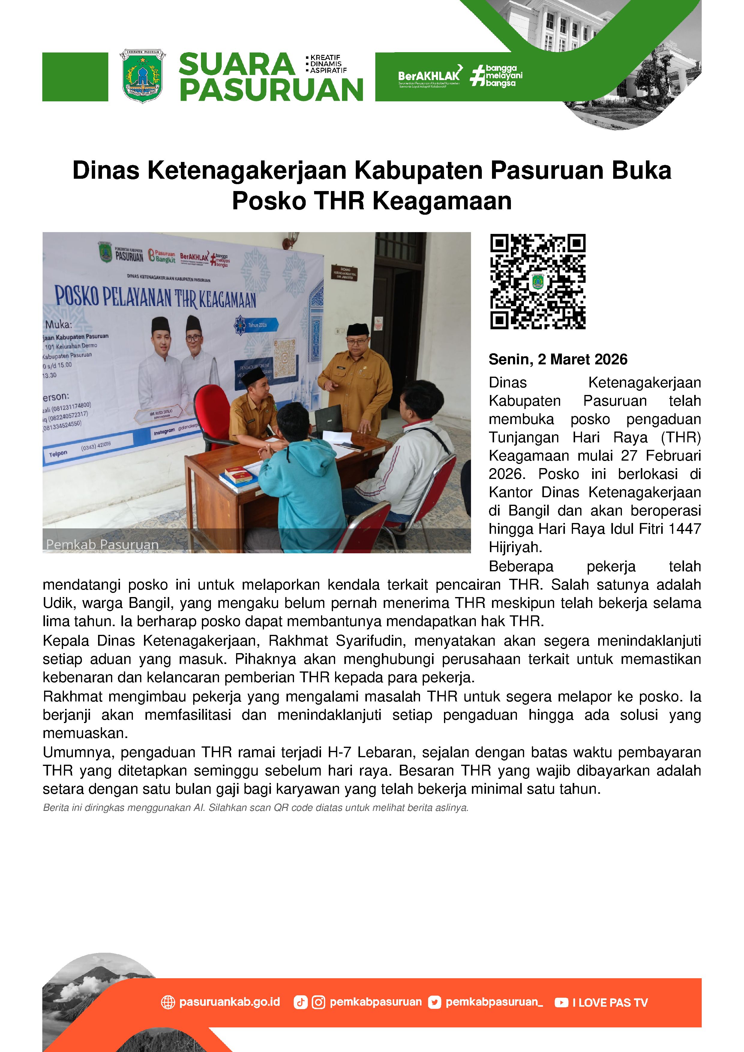 Per 27 Pebruari 2026, Pemerintah Kabupaten Pasuruan melalui Dinas Ketenagakerjaan membuka Posko Pengaduan Tunjangan Hari Raya (THR) Keagamaaan.