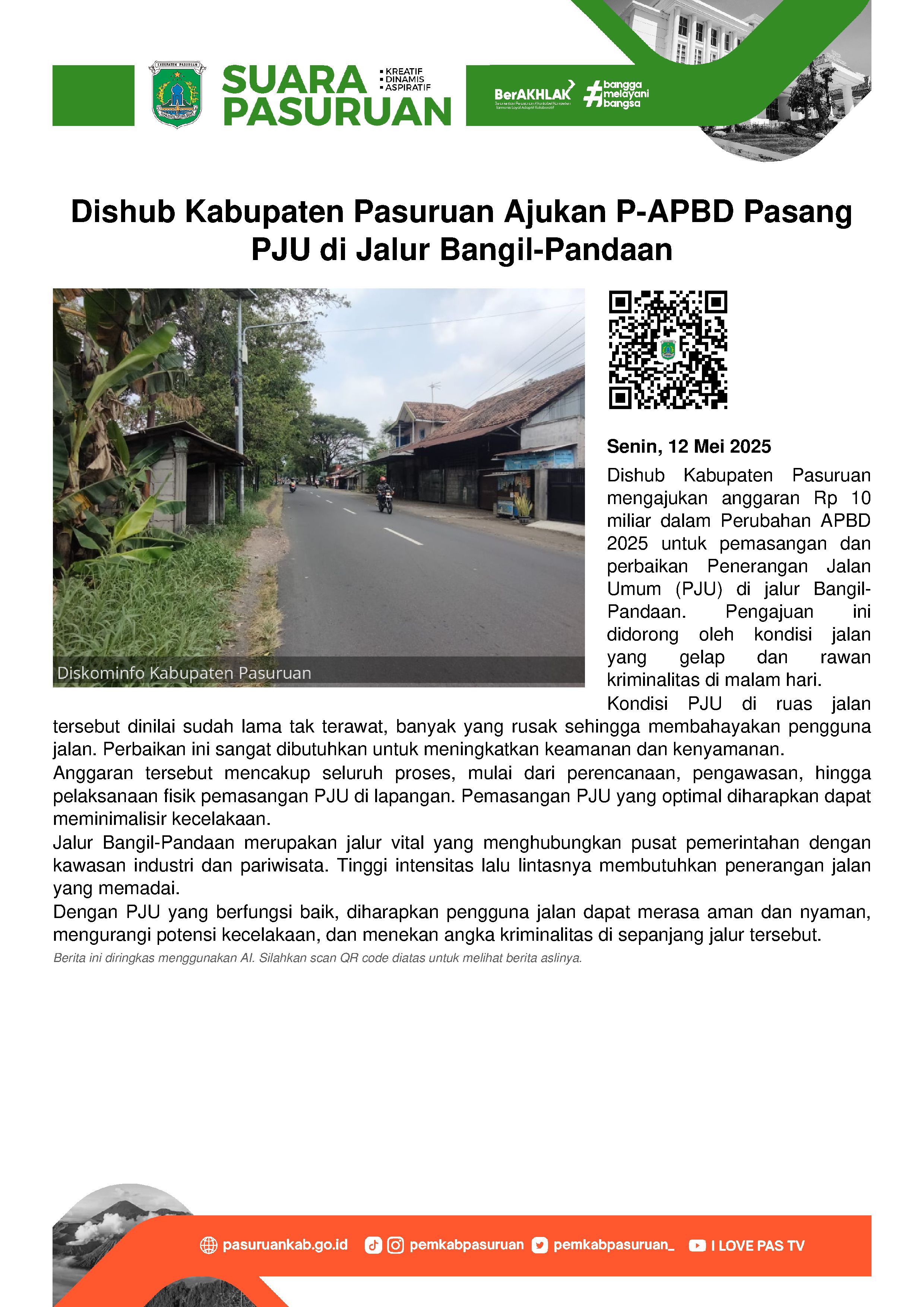Pemerintah Kabupaten Pasuruan melalui Dinas Perhubungan tahun ini mengajukan anggaran untuk pembenahan sekaligus pemasangan Penerangan Jalan Umum (PJU) di sepanjang ruas jalan Bangil - Pandaan.