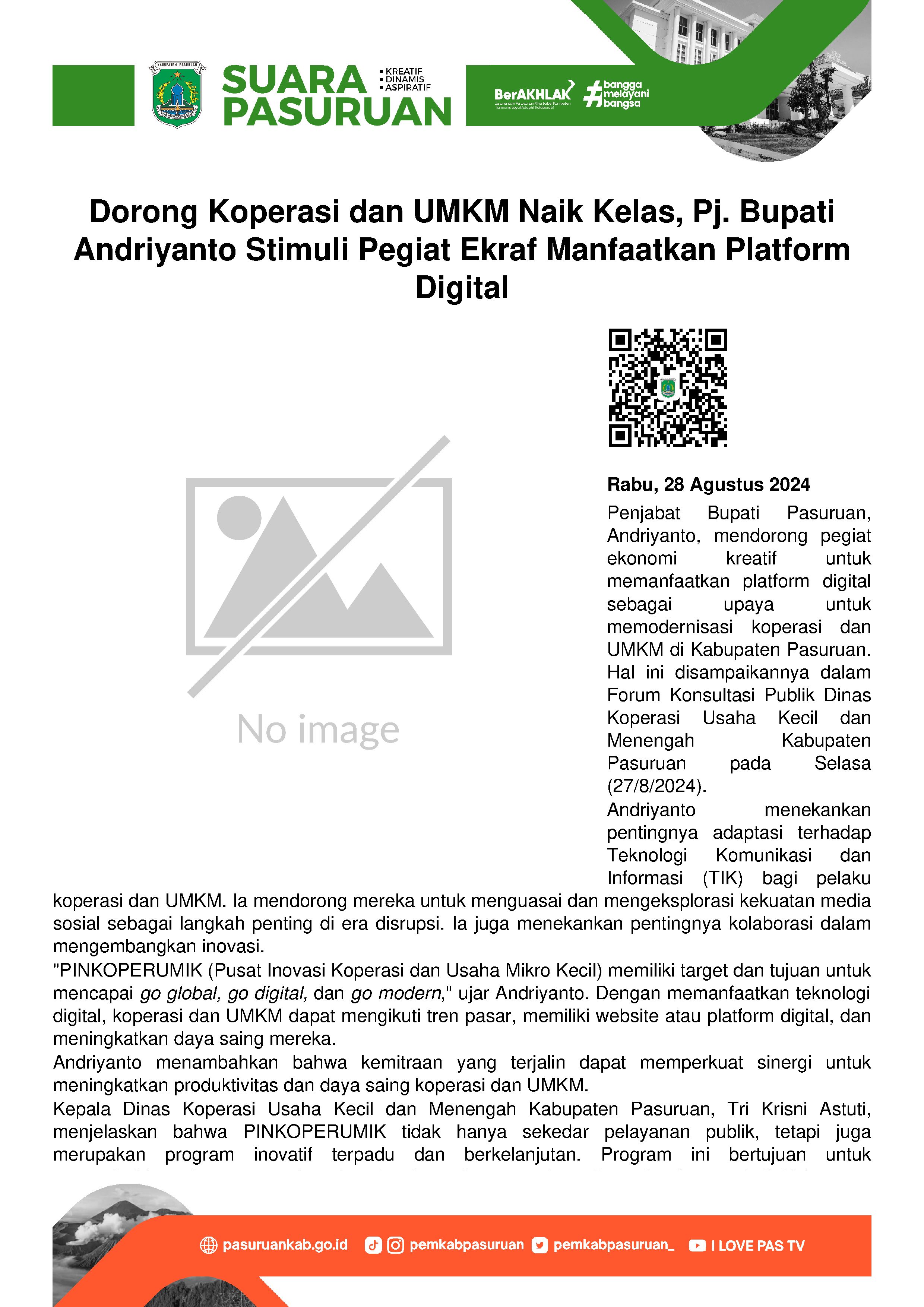 Untuk mewujudkan Koperasi dan Usaha Mikro, Kecil dan Menengah (UMKM) naik kelas dan lebih modern, Penjabat (Pj.) Bupati Pasuruan, Andriyanto mendorong pegiat ekonomi kreatif agar mampu memanfaatkan platform digital. Ajakan itu disampaikannya pada saat membuka Forum Konsultasi Publik Dinas Koperasi Usaha Kecil dan Menengah Kabupaten Pasuruan yang dilaksanakan pada hari Selasa (27/8/2024).