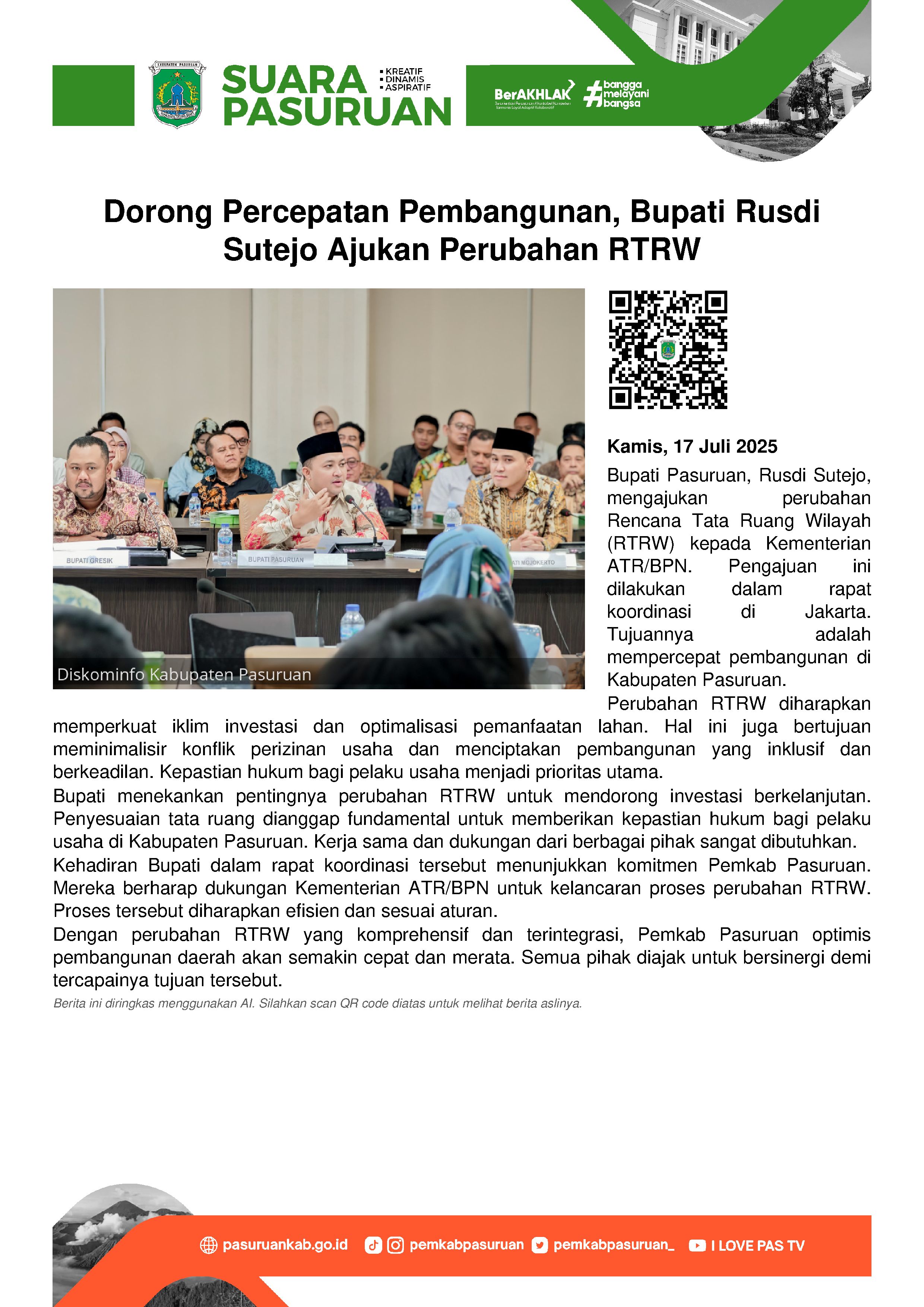Pengajuan ini disampaikan langsung oleh Bupati Pasuruan, Rusdi Sutejo dengan menghadiri rapat koordinasi bersama sejumlah kepala daerah di Kementerian Agraria dan Tata Ruang/Badan Pertanahan Nasional (ATR/BPN) di Jakarta, Rabu (16/7/2025).