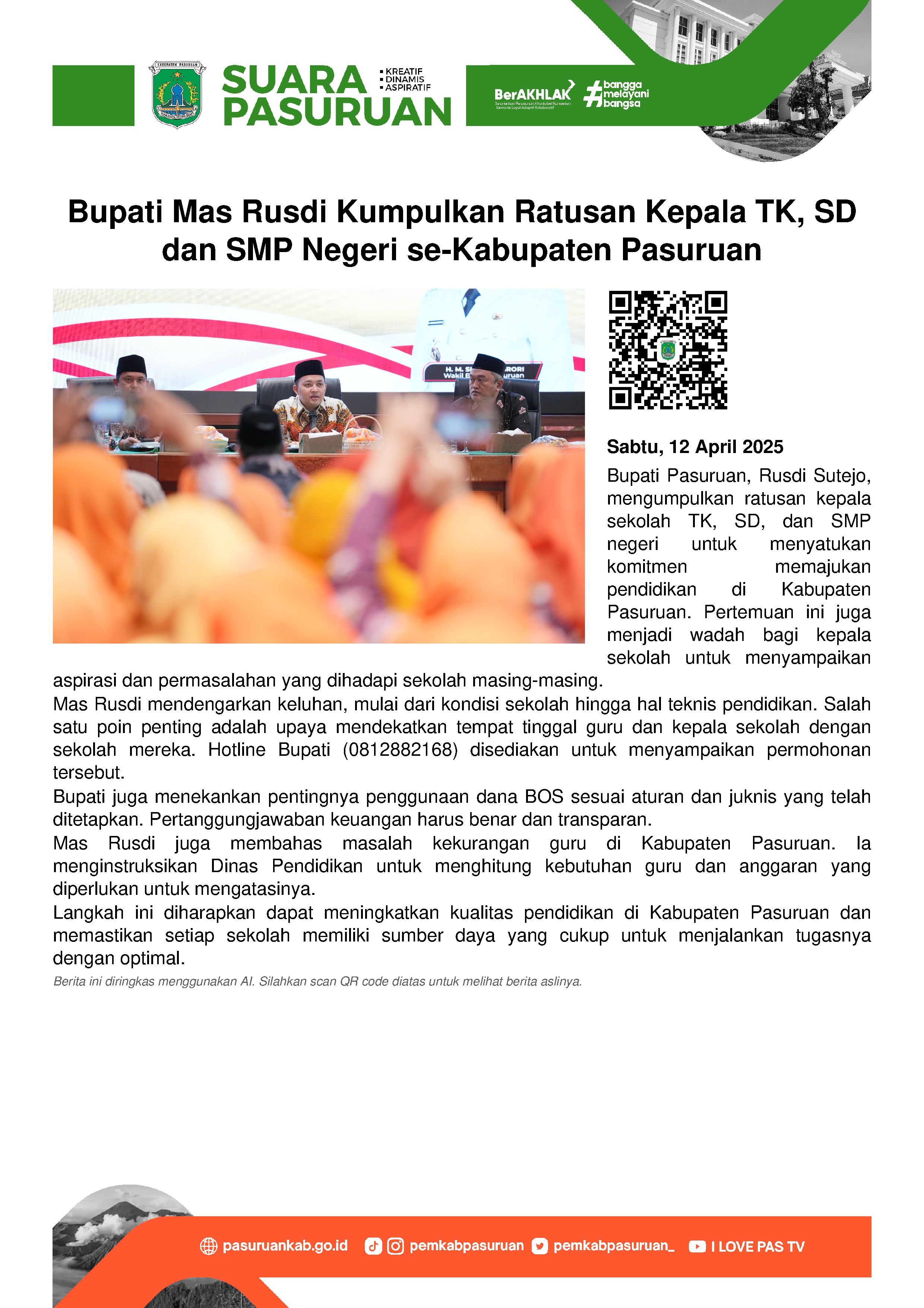 Sementara itu, Bupati Pasuruan, Rusdi Sutedjo, juga hadir dalam aksi damai tersebut dan memberikan tanggapan langsung. Ia menegaskan bahwa pemerintah daerah tidak menutup mata atas masukan yang diberikan mahasiswa.