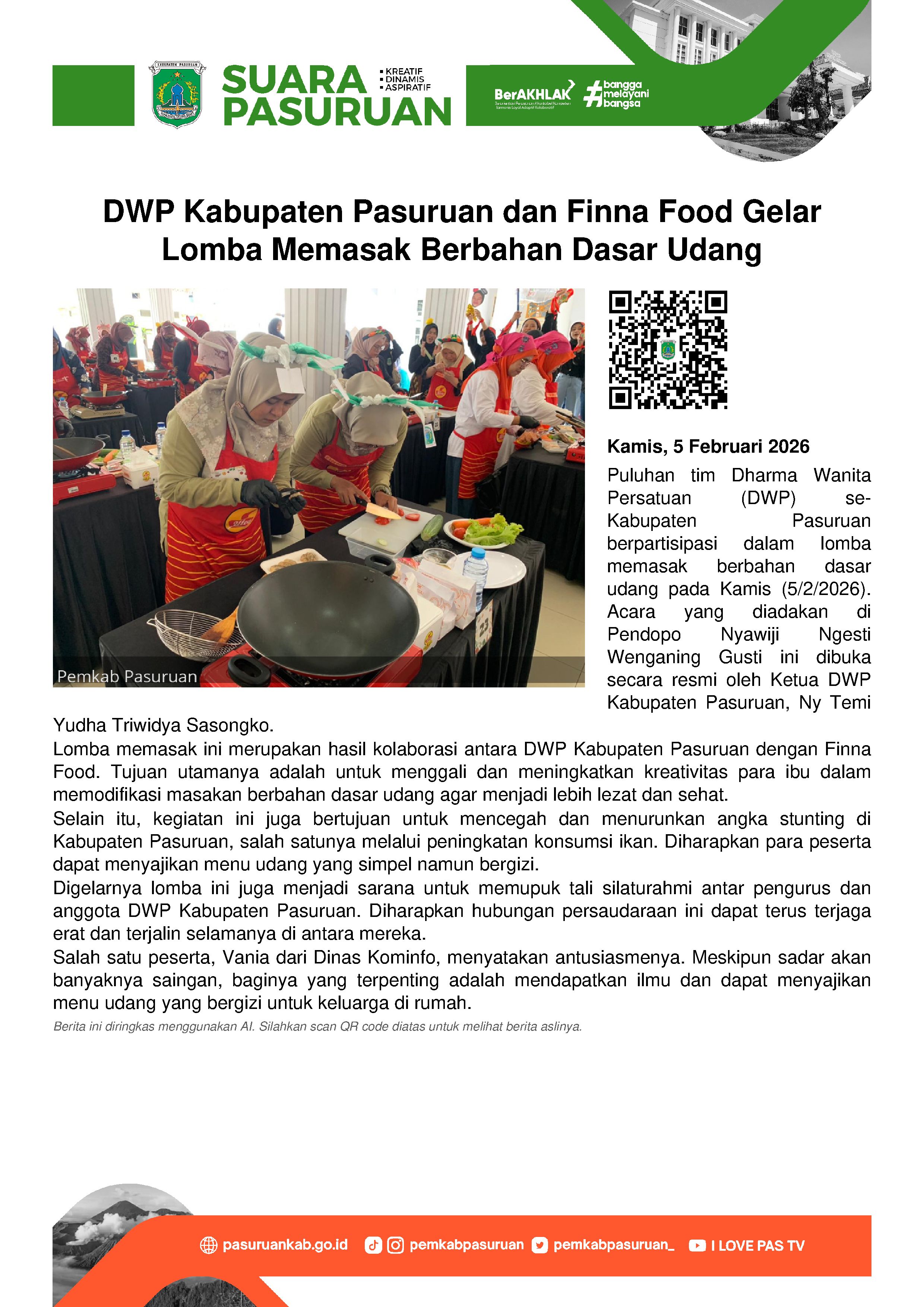 Dalam sambutannya, Temi mengatakan, lomba ini merupaka kolaborasi antara DWP Kabupaten Pasuruan dengan Finna Food. Tujuannya tak lain untuk menggali kreatifitas ibu ibu dalam memodifikasi jenis masakan yang berbahan dasar udang.