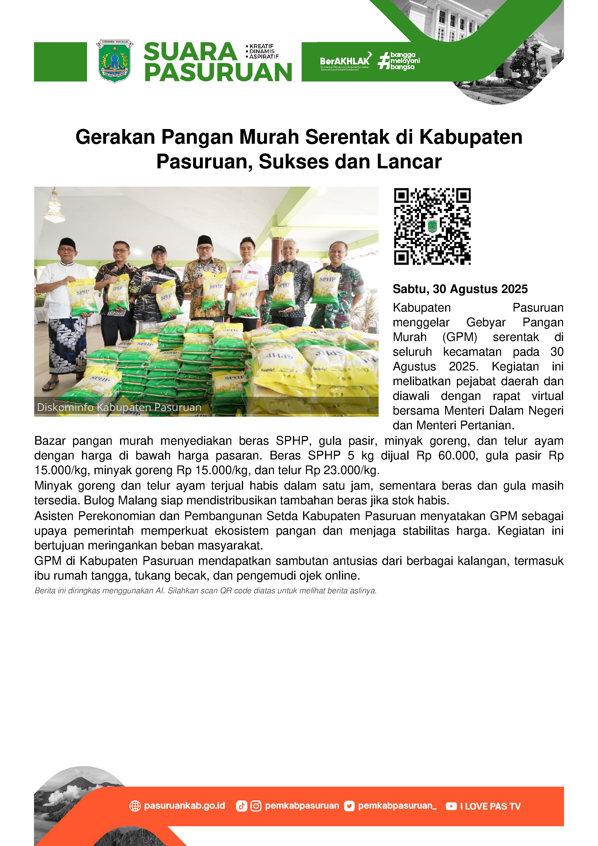 Pemerintah Kabupaten Pasuruan melaksanakan Gebyar Pangan Murah (GPM) serentak di seluruh kecamatan, Sabtu (30/8/2025).
