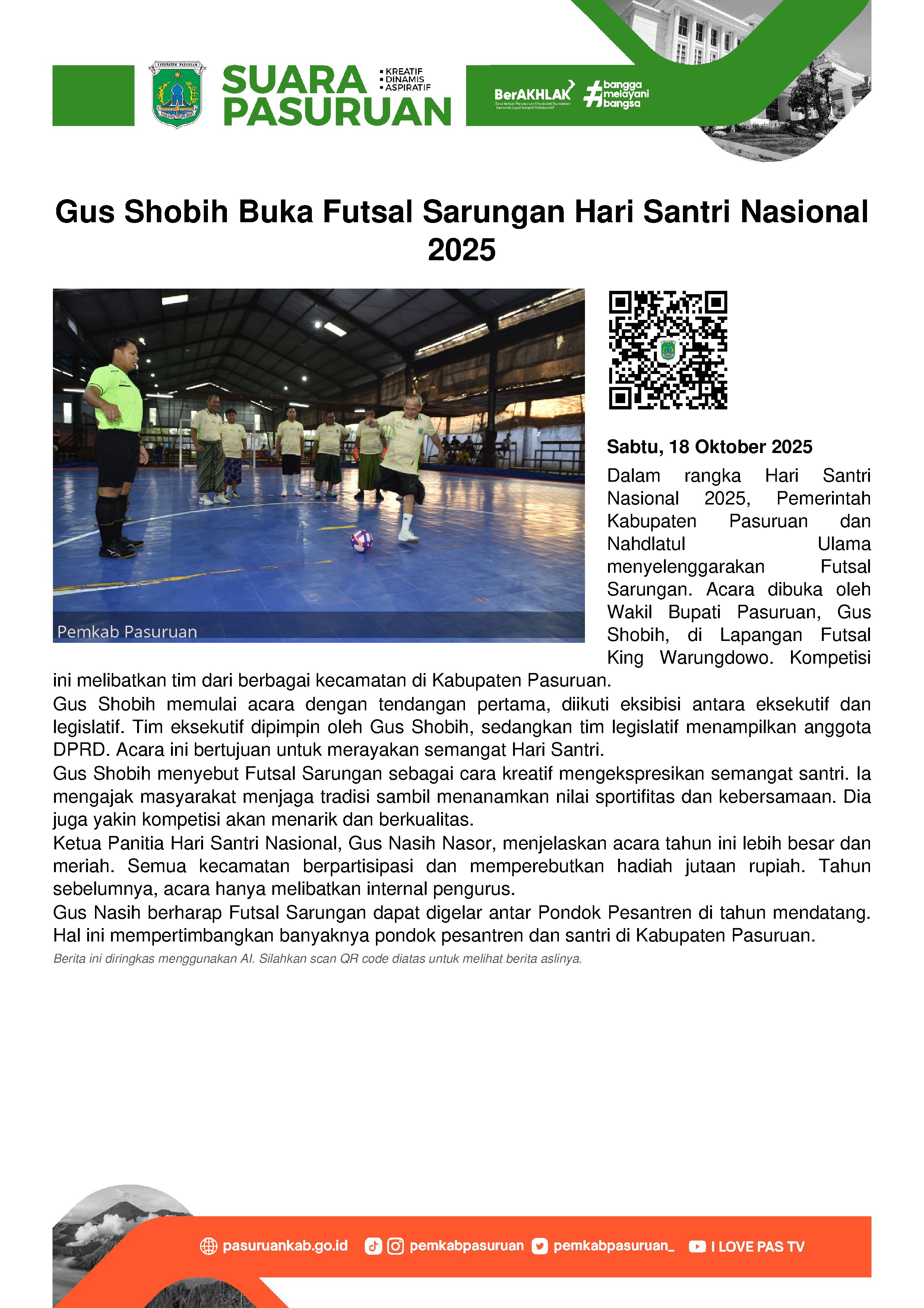Memeriahkan Hari Santri Nasional tahun 2025, Pemerintah Kabupaten Pasuruan bersama Nahdhatul Ulama menggelar Futsal Sarungan.