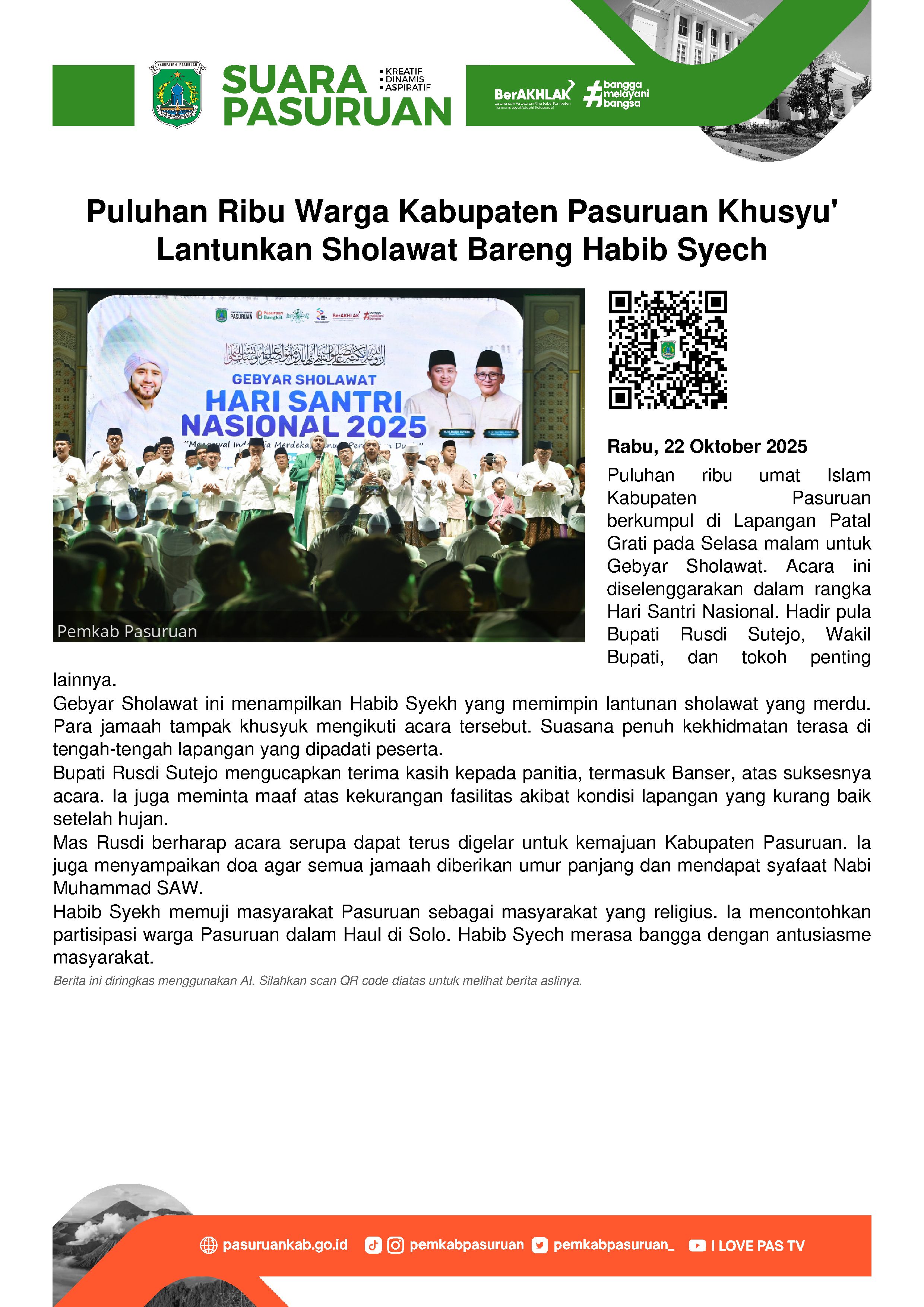 Puluhan ribu umat islam dari berbagai Kecamatan di Kabupaten Pasuruan tumpah ruah menghadiri Gebyar Sholawat dalam rangka Hari Santri Nasional di Lapangan Patal Grati, Selasa (21/10/2025) malam.