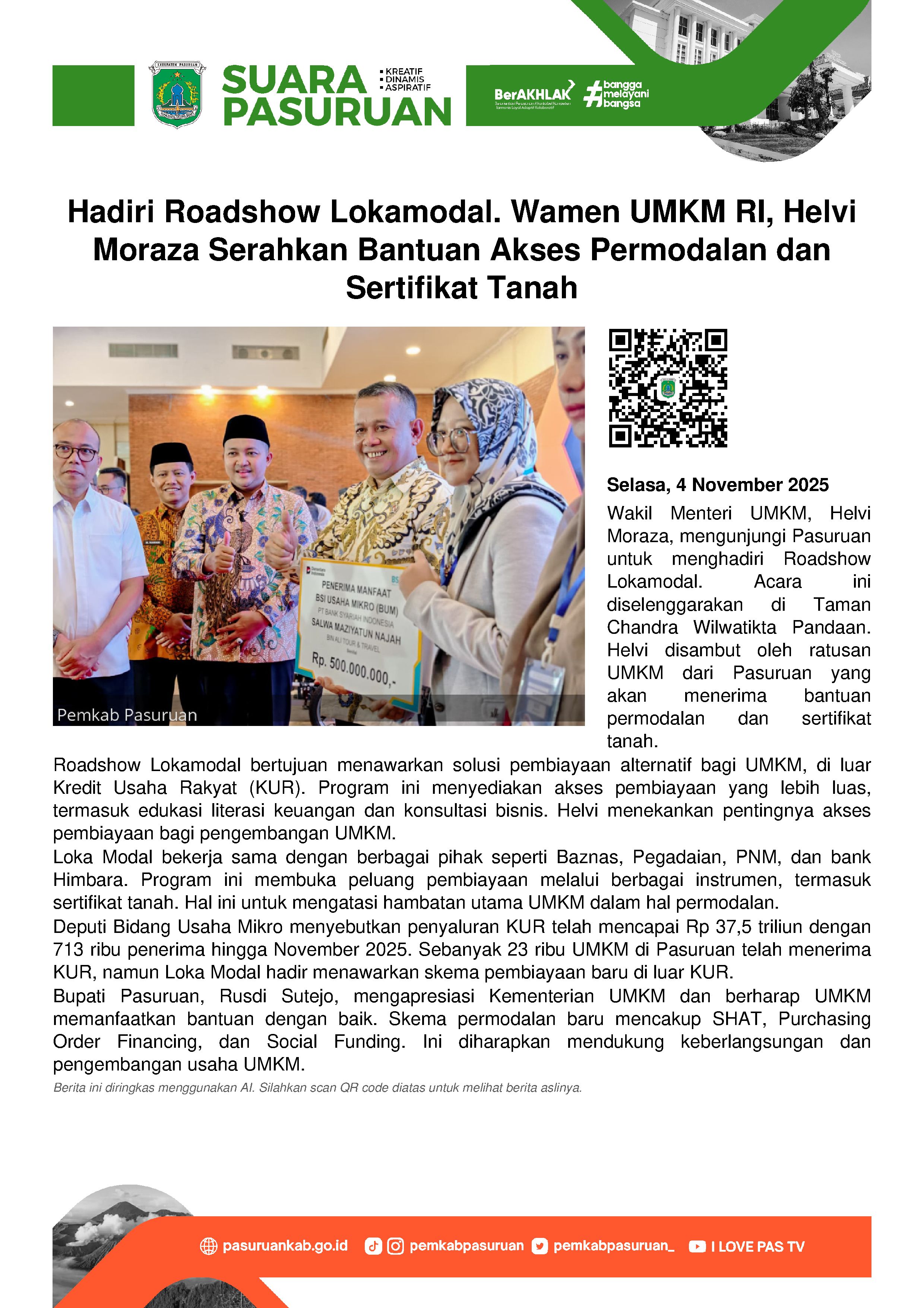 Di hadapan ratusan UMKM, Helvi menegaskan bahwa loka modal adalah kabar baik. Mengingat pembiayaan sering kali menjadi hambatan utama pelaku UMKM untuk berkembang.