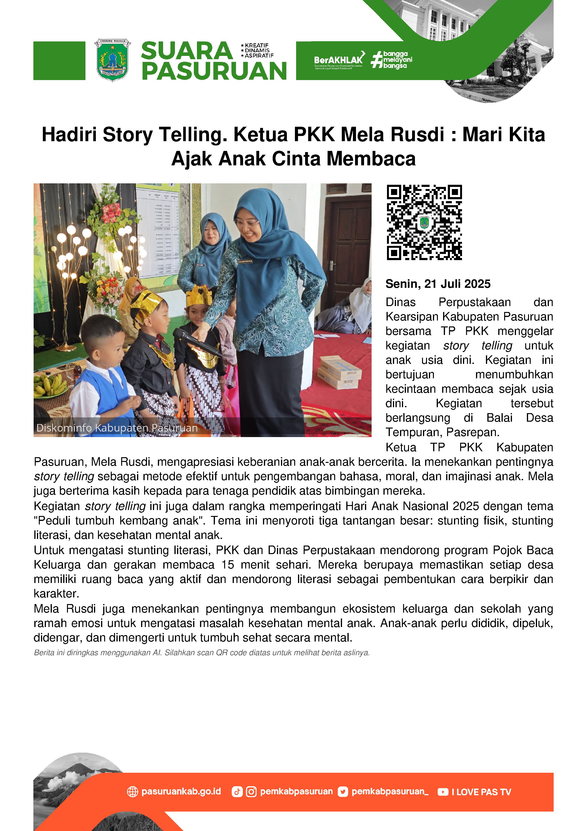 Lebih lanjut Mela menegaskan gelaran acara story telling juga menjadi kegiatan dalam rangka memperingati Hari Anak Nasional (HAN) tahun 2025 dengan tema "Peduli tumbuh kembang anak : Bebas stunting, melek literasi, sehat mental".