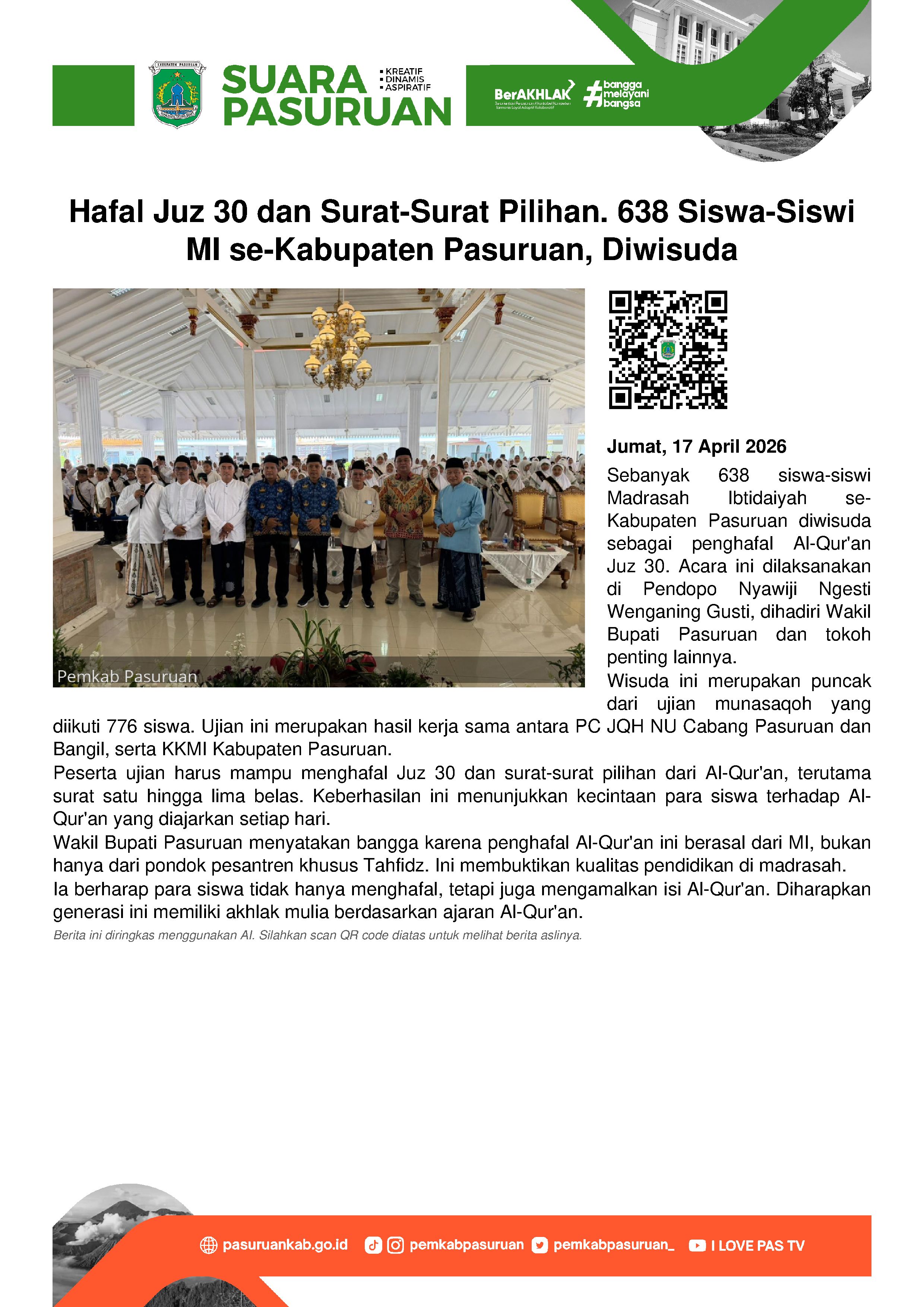 Sebanyak 638 siswi/siswi Madrasah Ibtidaiyah (MI) se-Kabupaten Pasuruan resmi diwisuda sebagai Penghafal Al Qur'an Juz 30.