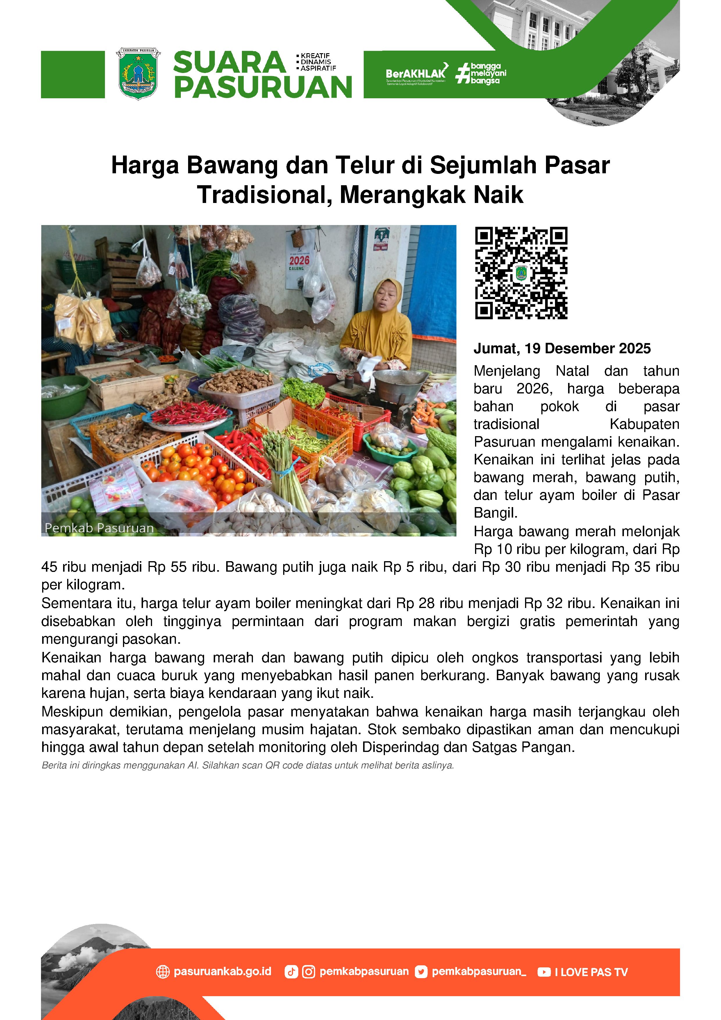 Menjelang Natal dan tahun baru 2026, harga sejumlah bahan pokok di pasar-pasar tradisional di Kabupaten Pasuruan, mengalami kenaikan.