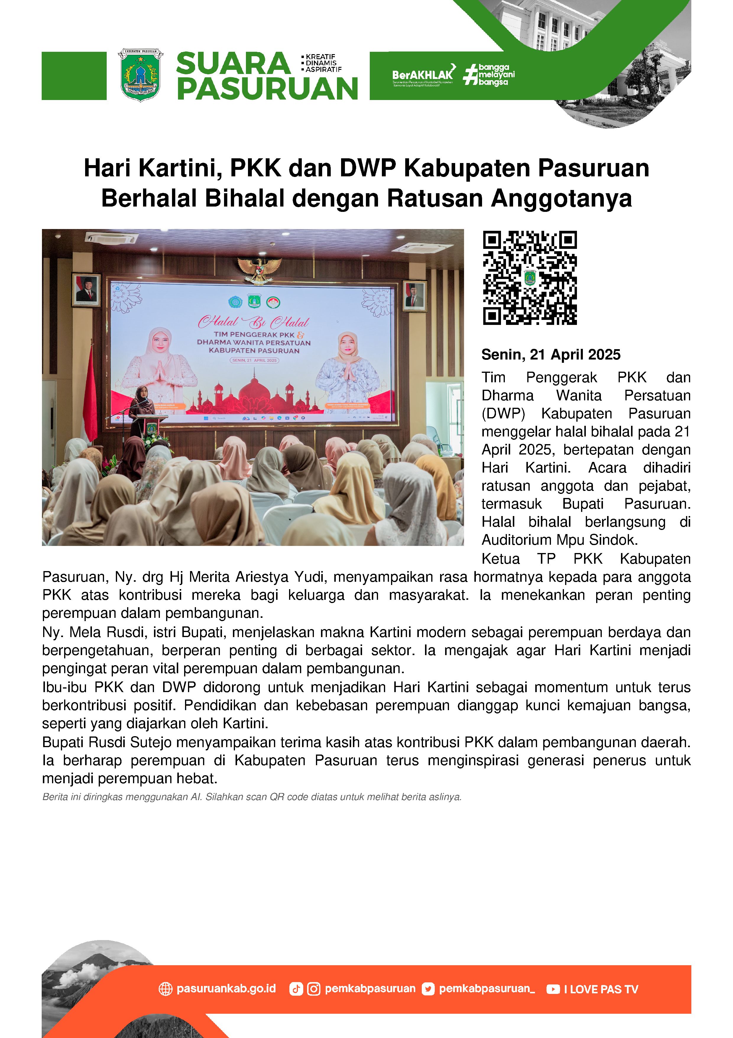 Oleh sebab itu, ia mengajak Tim Penggerak PKK dan DWP serta para perempuan di Kabupaten Pasuruan untuk menjadikan Hari Kartini bukan hanya sekadar simbol perjuangan perempuan. Tetapi juga sebagai pengingat bahwa perempuan memiliki peran yang sangat penting dalam pembangunan sosial, ekonomi, dan budaya.