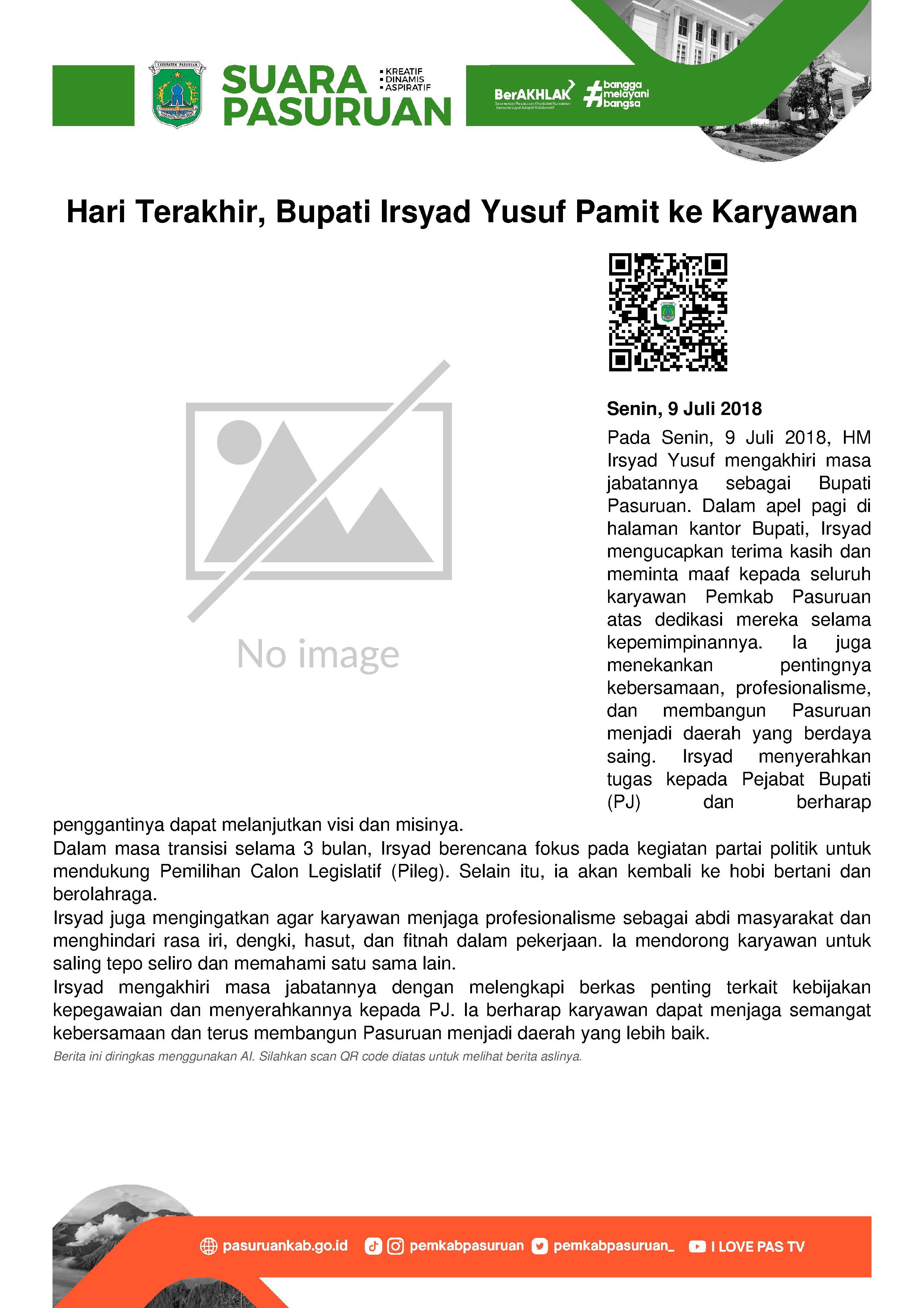 Ditambahkan Irsyad, hari terakhir menjabat sebagai Bupati Pasuruan dipergunakan untuk melengkapi beberapa berkas penting yang harus ditanda tangani, utamanya terkait dengan kebijakan kepegawaian. Setelah selesai, dirinya memasrahkan sepenuhnya kepada Pejabat Bupati (PJ) sebagai pengganti dirinya.