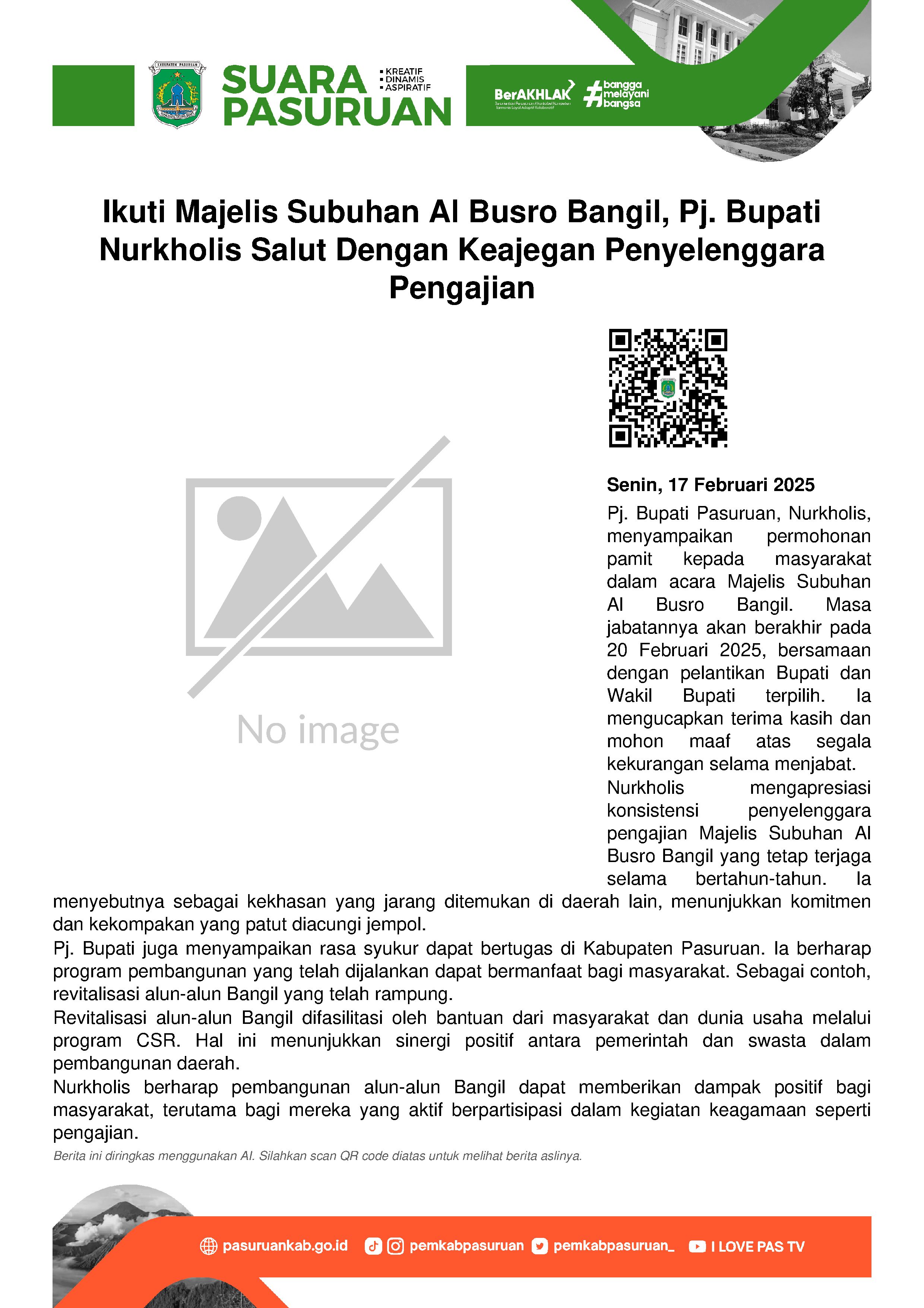 Pada saat menghadiri Majelis Subuhan Al Busyro Bangil pada hari Minggu (16/2/2025), Penjabat (Pj.) Bupati Pasuruan, Nurkholis menyampaikan permohonan pamitnya. Baik yang ditujukan kepada jamaah pengajian maupun seluruh masyarakat Kabupaten Pasuruan. Hal itu diungkapkan menjelang berakhirnya masa tugasnya memimpin Kabupaten Pasuruan selama hampir 5 bulan terakhir.  Â