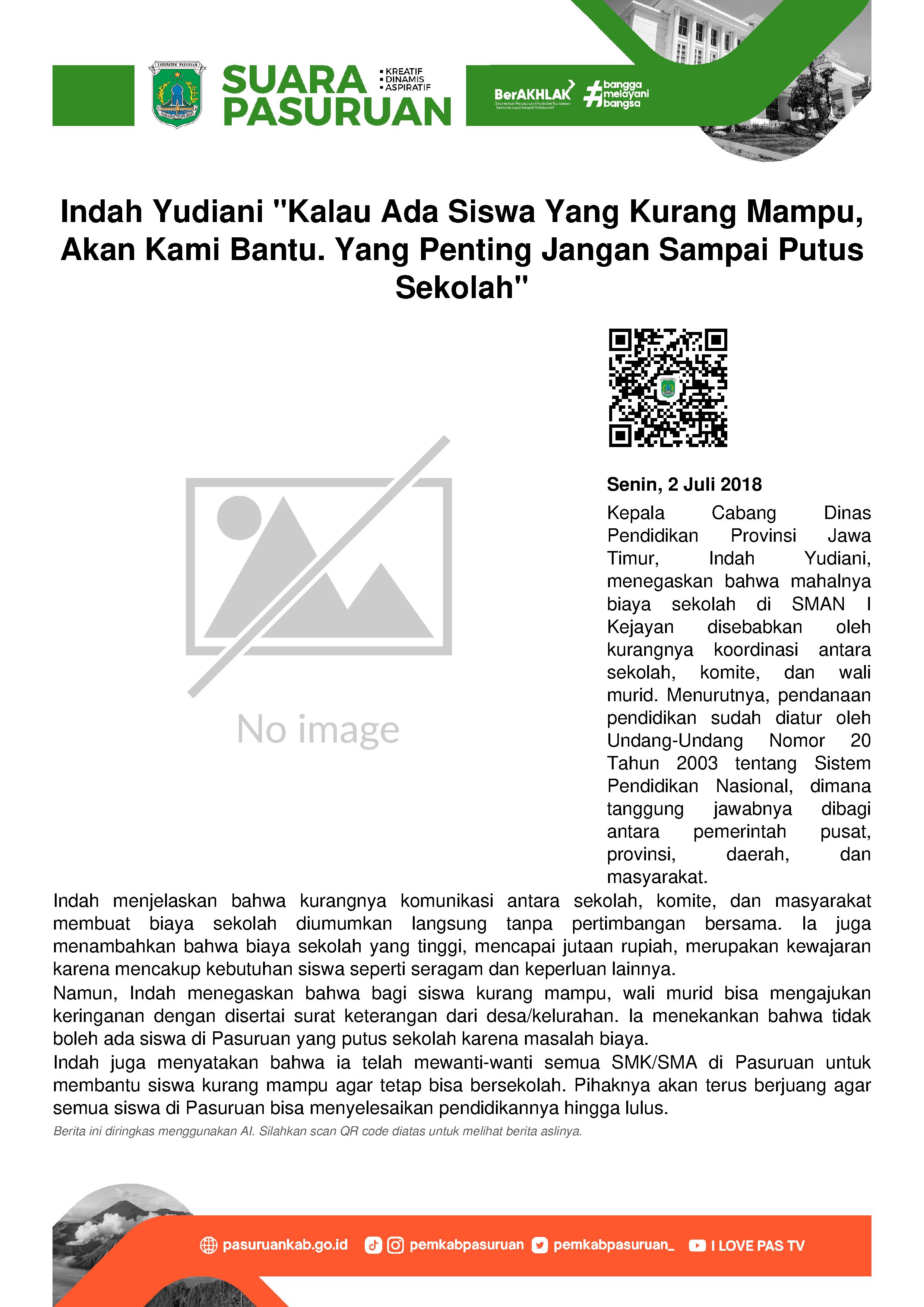 Polemik mahalnya biaya sekolah untuk peserta didik baru di kalangan siswa sekolah menengah atas di Pasuruan, ditanggapi langsung oleh Kepala Cabang Dinas Pendidikan Provinsi Jawa Timur untuk wilayah Kota dan Kabupaten Pasuruan, Indah Yudiani.
