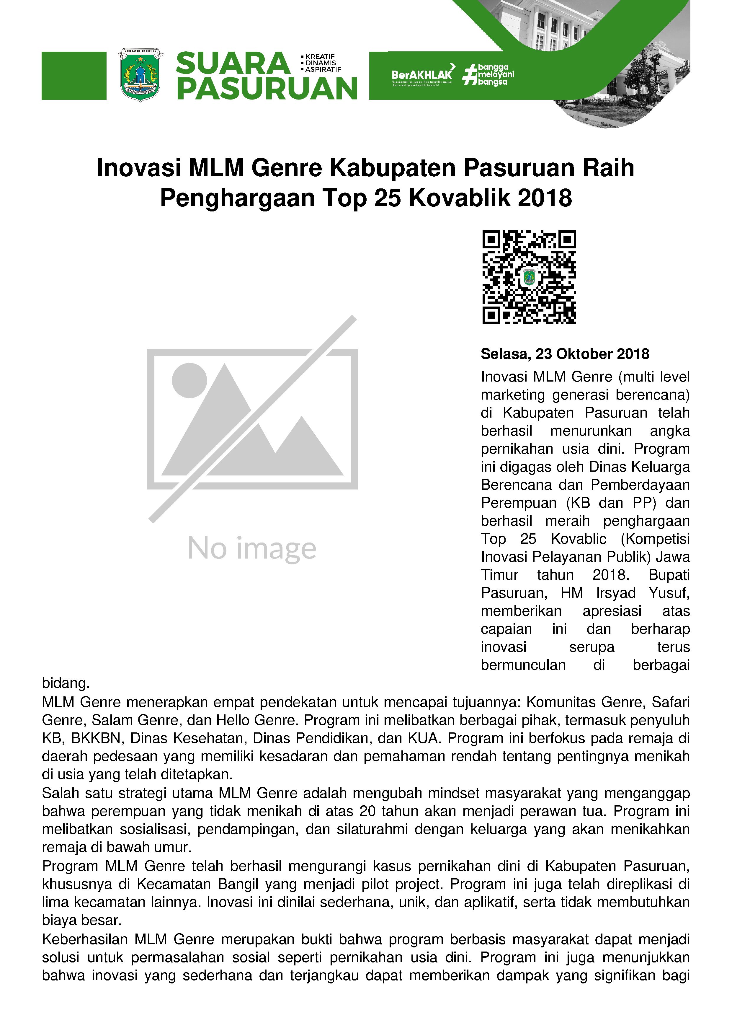 Inovasi MLM Genre (multi level marketing generasi berencana) yang digagas Dinas Keluarga Berencana dan Pemberdayaan Perempuan (KB dan PP) Kabupaten Pasuruan, tak hanya sukses menurunkan jumlah kasus pernikahan usia dini, melainkan sampai diganjar penghargaan sebagai Top 25 Kovablic (Kompetisi Inovasi Pelayanan Publik) Jawa Timur tahun 2018.
