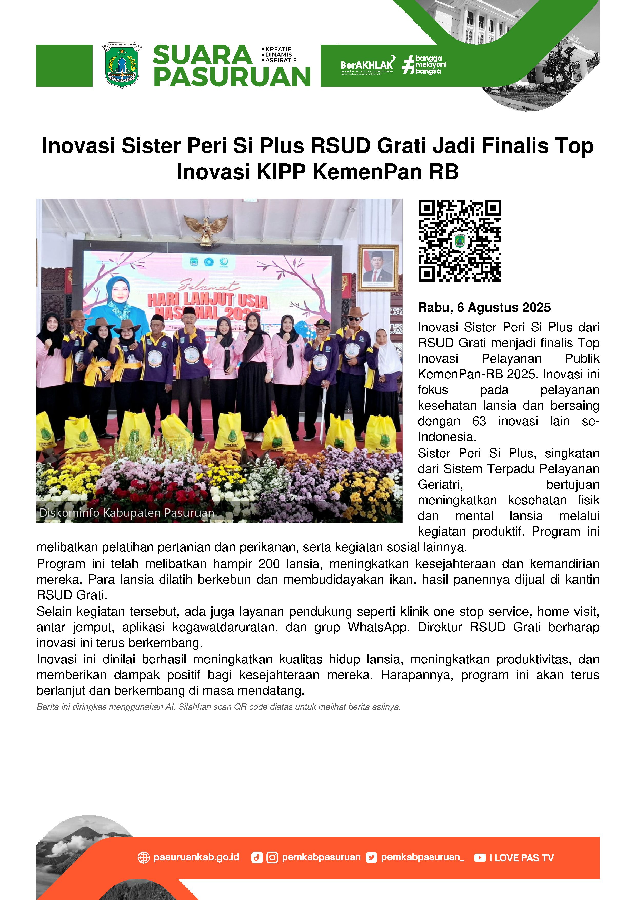 Inovasi Sister Peri Si Plus RSUD Grati terpilih masuk sebagai finalis top inovasi pelayanan publik Kompetisi Inovasi Pelayanan Publik (KIPP) Kementerian Pendayagunaan Aparatur Negara dan Reformasi Birokrasi (KemenPan-RB) Tahun 2025.