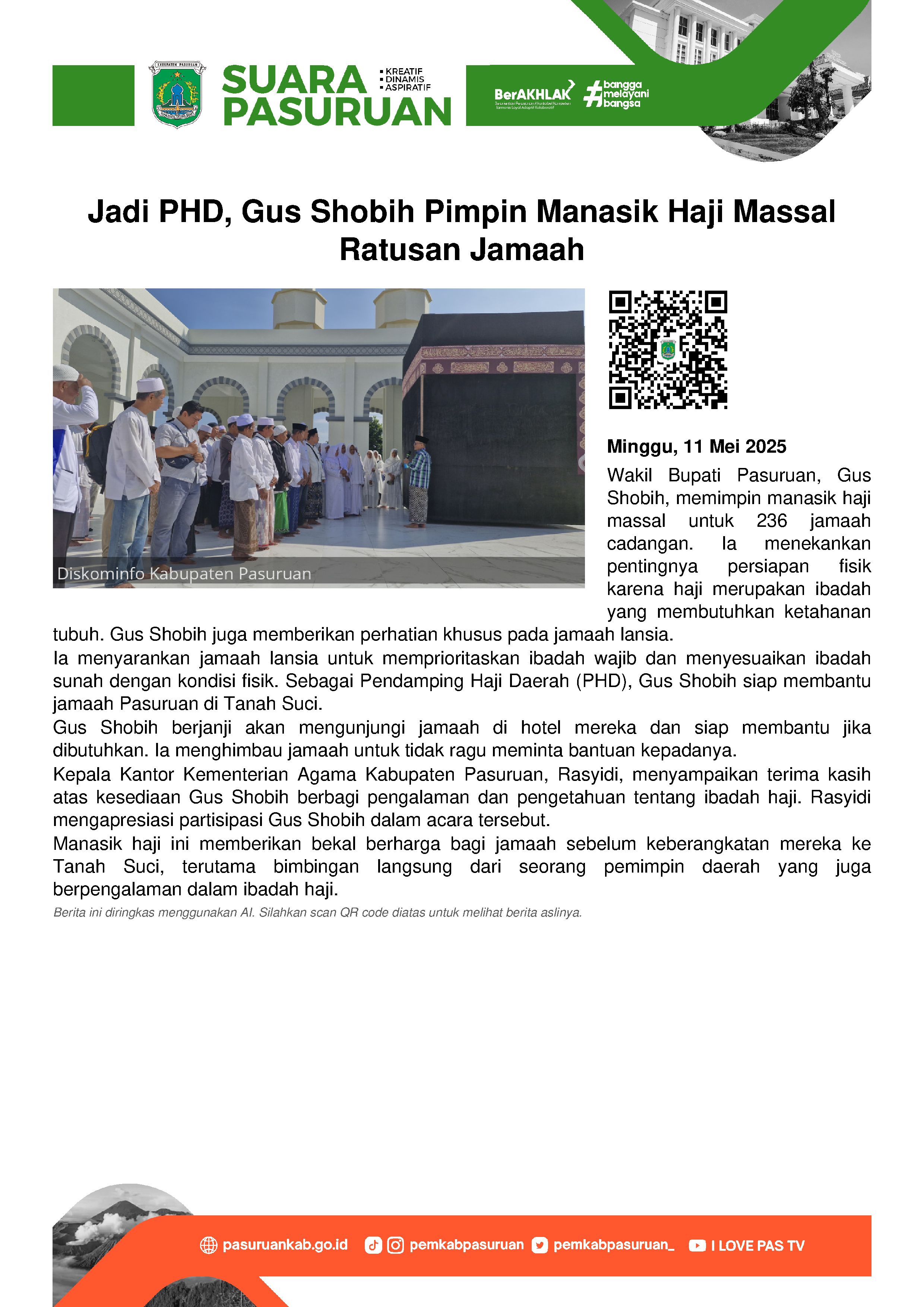 Ia pun meminta jamaah Kabupaten Pasuruan untuk tak sungkan-sungkan meminta bantuan kepadanya. Sebab hal tersebut sudah menjadi tanggung jawabnya sebagai seorang petugas haji daerah.