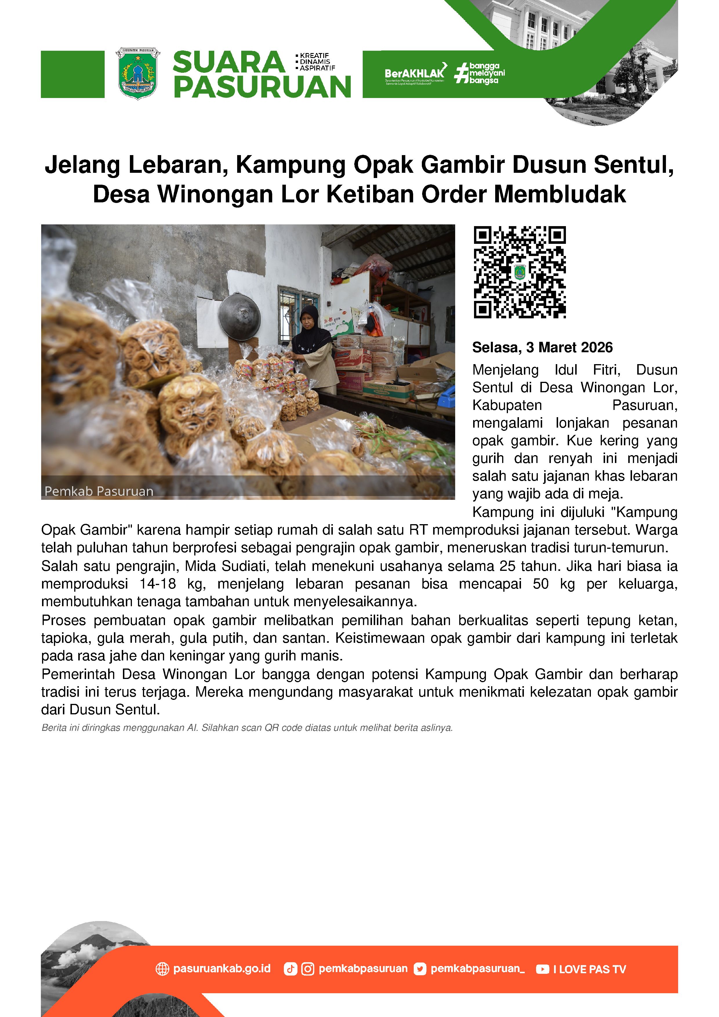 Di Kabupaten Pasuruan, salah satu jajanan yang wajib ada adalah opak gambir. Makanan ringan yang memiliki cita rasa yang gurih dan renyah ini ternyata banyak diproduksi di Dusun Sentul, Desa Winongan Lor, Kecamatan Winongan.