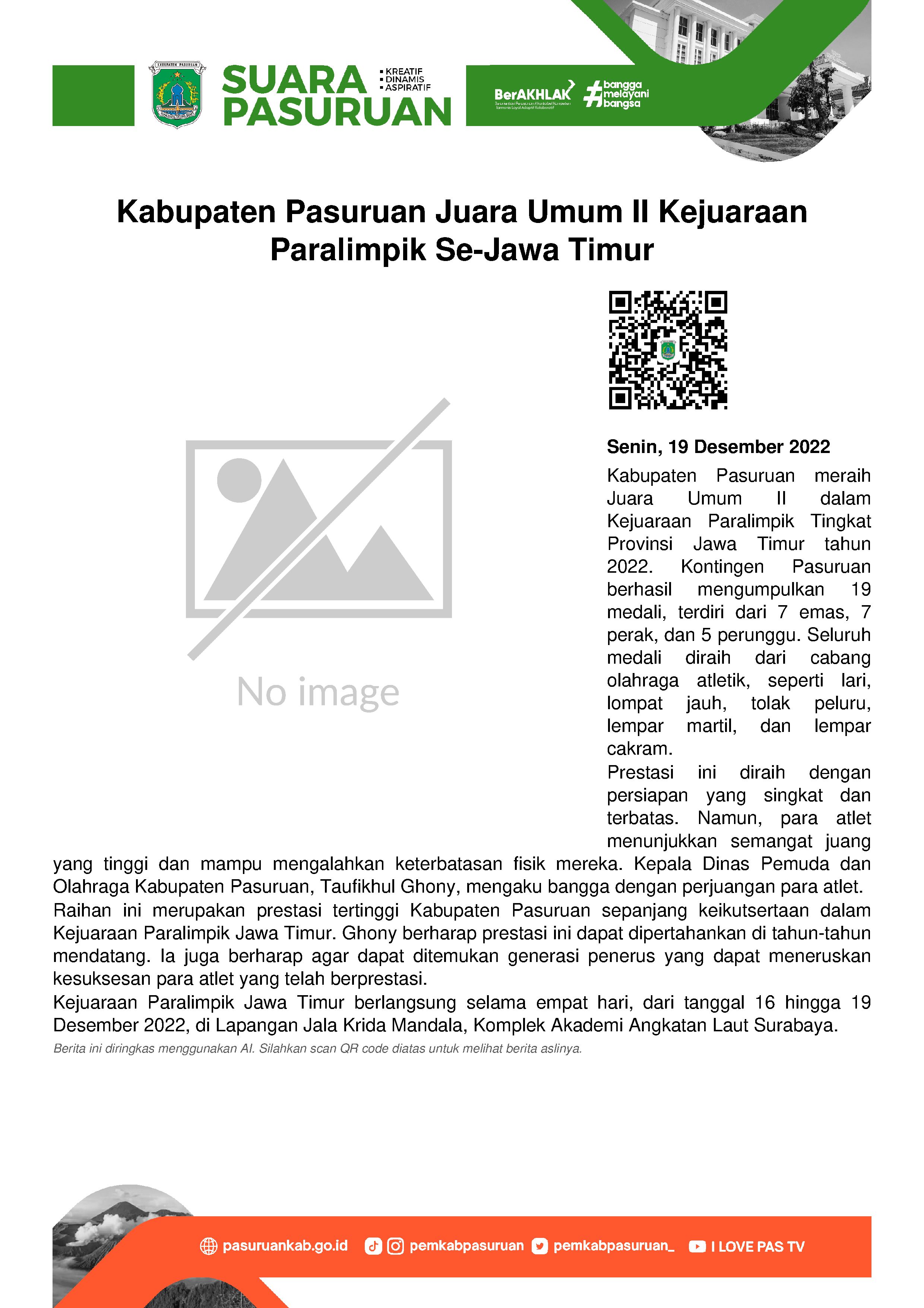 Kontingen Kabupaten Pasuruan berhasil meraih Juara Umum II dalam ajang Kejuaraan Paralimpik Tingkat Provinsi Jawa Timur tahun 2022.