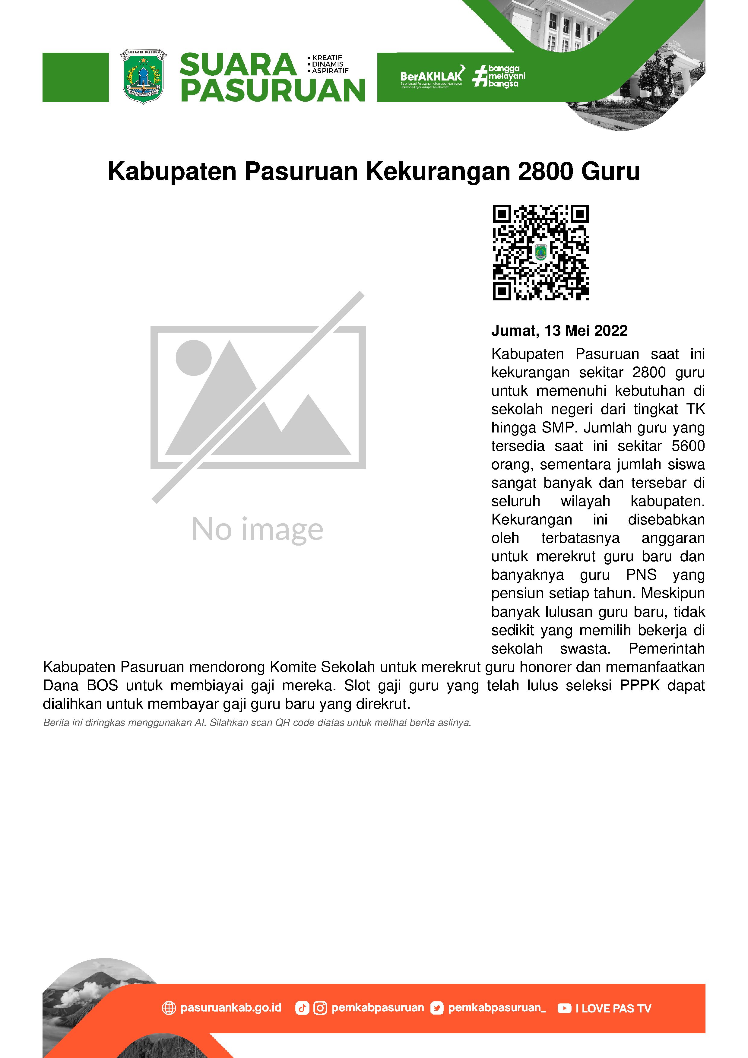 Kabupaten Pasuruan masih kekurangan guru.