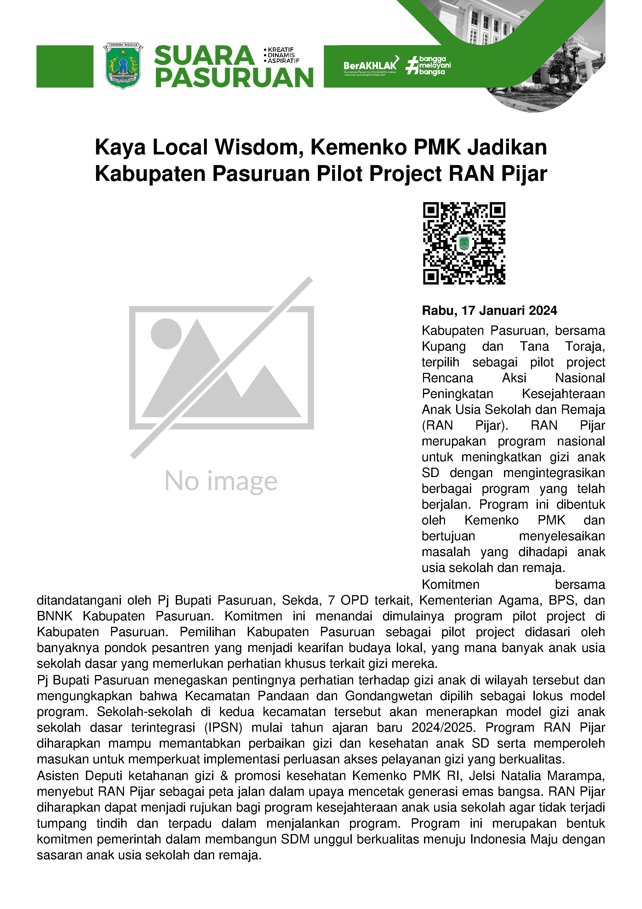 "Kabupaten Pasuruan ini dikenal sebagai gudangnya santri, kiyai, dan berati gudangnya pondok pesantren. Terima kasih sekali sehingga Kemenko PMK menjadikan Kabupaten Pasuruan sebagai pilot project RAN Pijar," katanya.