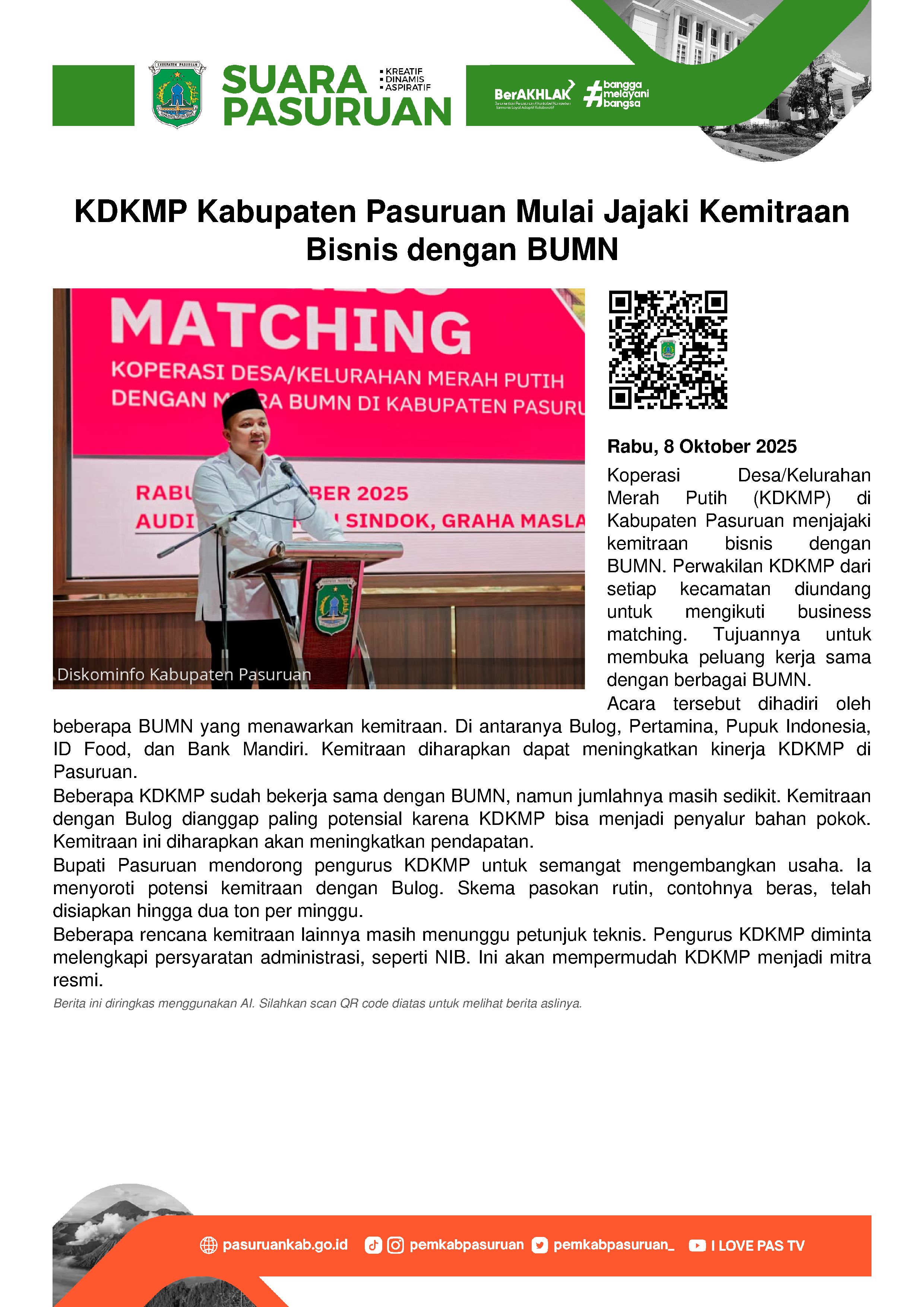 Hal ini diketahui saat perwakilan KDKMP di setiap kecamatan diundang untuk mengikuti business matching atau kontak bisnis yang digelar di Audtitorium Mpu Sindok, Komplek Kantor Bupati Pasuruan, Rabu (8/10/2025).