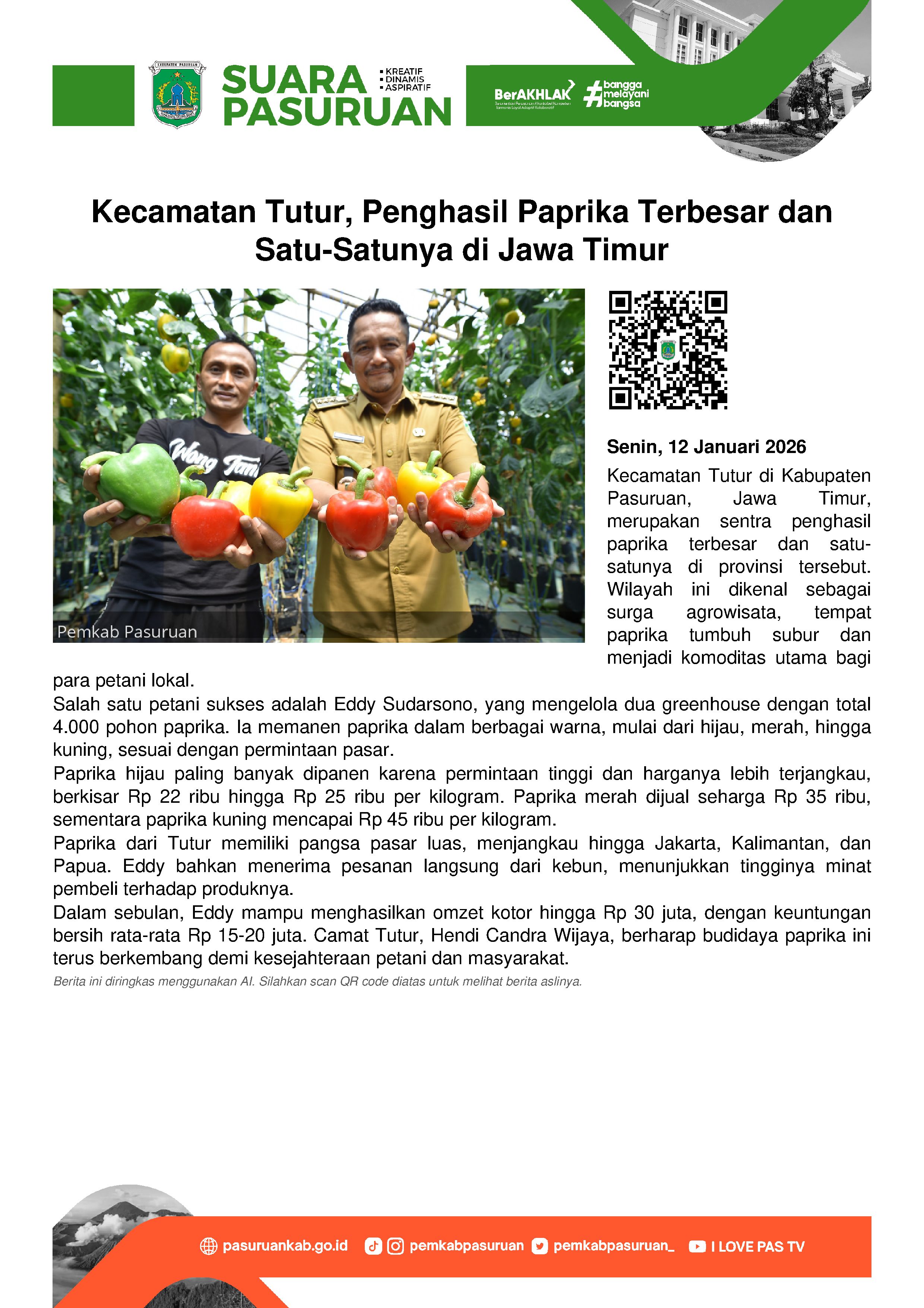 Sementara itu, Camat Tutur, Hendi Candra Wijaya menegaskan ratusan ribu tanaman Paprika tumbuh dan berkembang di beberapa desa di Kecamatan Tutur yang secara geografis dengan ketinggian 900 mdpl di lereng gunung Bromo.