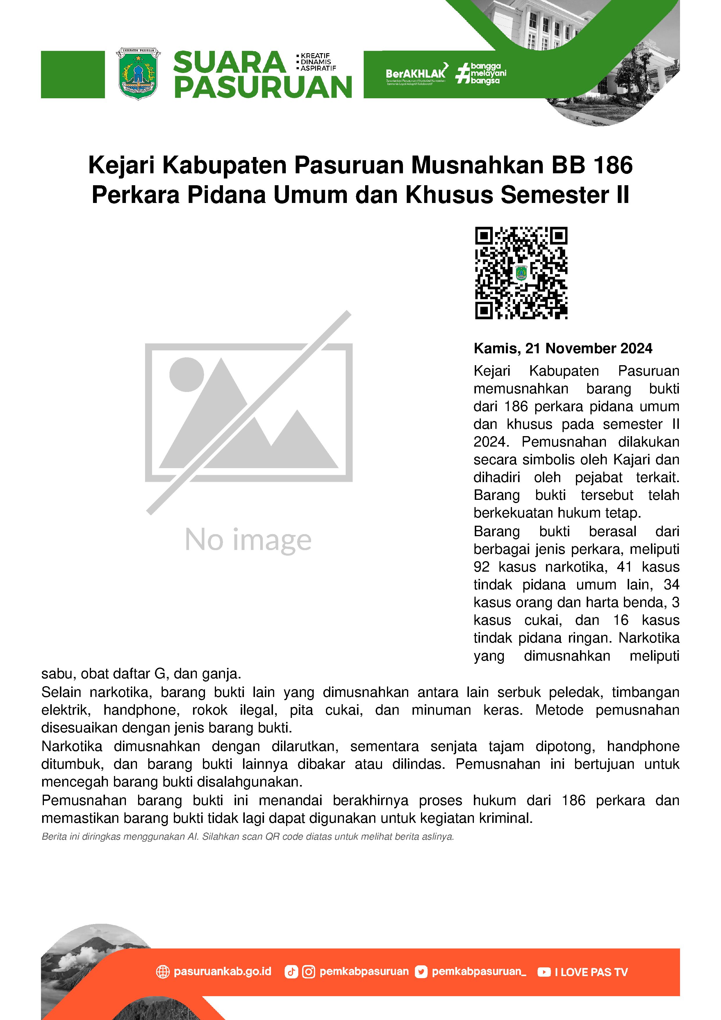 Kejaksaan Negeri (Kejari) Kabupaten Pasuruan memusnahkan barang bukti hasil pidana umum dan khusus yang sudah berkekuatan hukum tetap selama Semester II Tahun 2024.