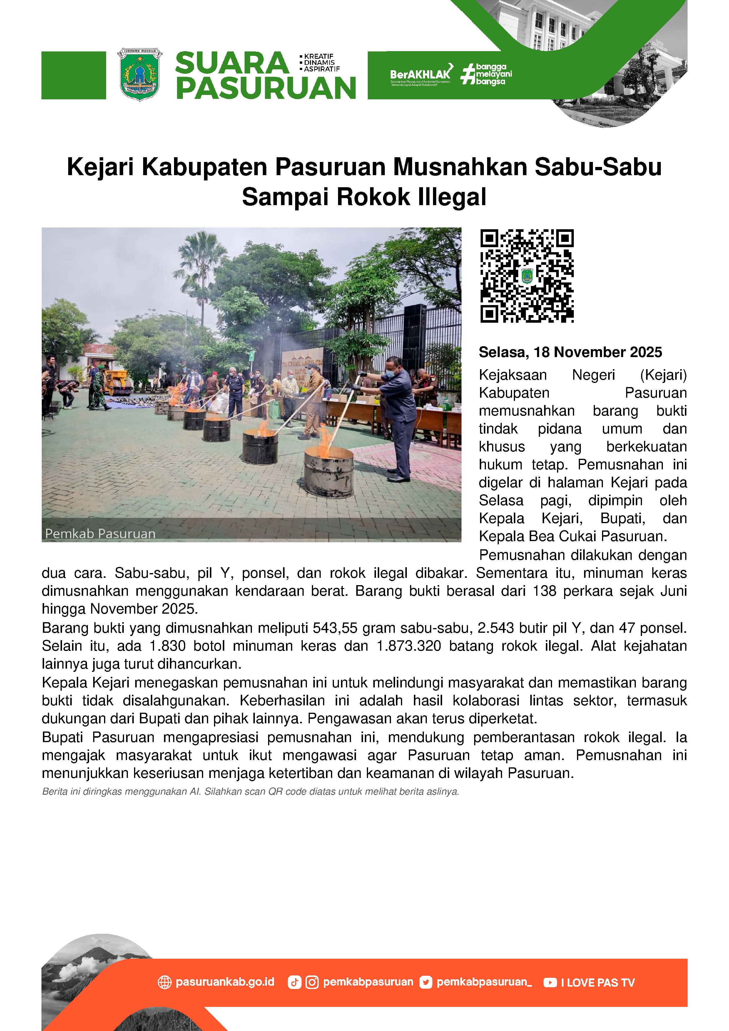 Pemusnahan seluruh barang bukti tersebut digelar di Halaman Kejari Kabupaten Pasuruan, Selasa (18/11/2025) pagi dan dipimpin oleh Kepala Kejari Kabupaten Pasuruan, Teguh Ananto; Bupati Pasuruan, Rusdi Sutejo serta Kepala Bea Cukai Pasuruan, Hatta Wardhana.