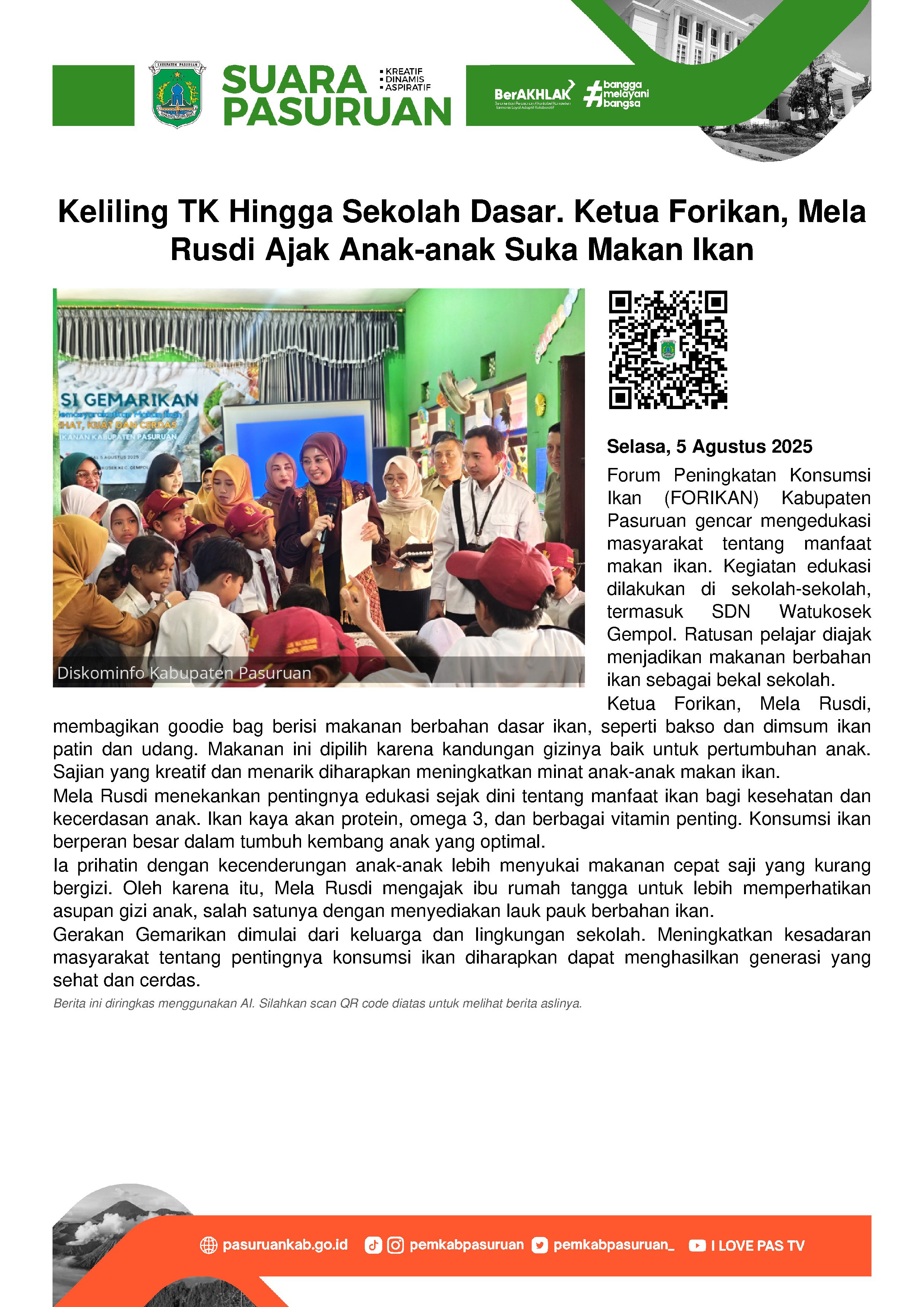 Seperti yang terlihat pada Selasa (5/8/2025) pagi. Ketua Forikan Kabupaten Pasuruan, drg Merita Ariestya Yudi bersama Wakil Ketua DPRD Kabupaten Pasuruan, Adinda Denisa; Kepala Dinas Pendidikan, Tri Krisni Astuti dan Plt Kadis Perikanan, Soegeng Soebijanto mengajak ratusan pelajar SDN Watukosek Gempol untuk menjadikan masakan serba ikan sebagai isi bekal makanan yang dibawa ke sekolah.