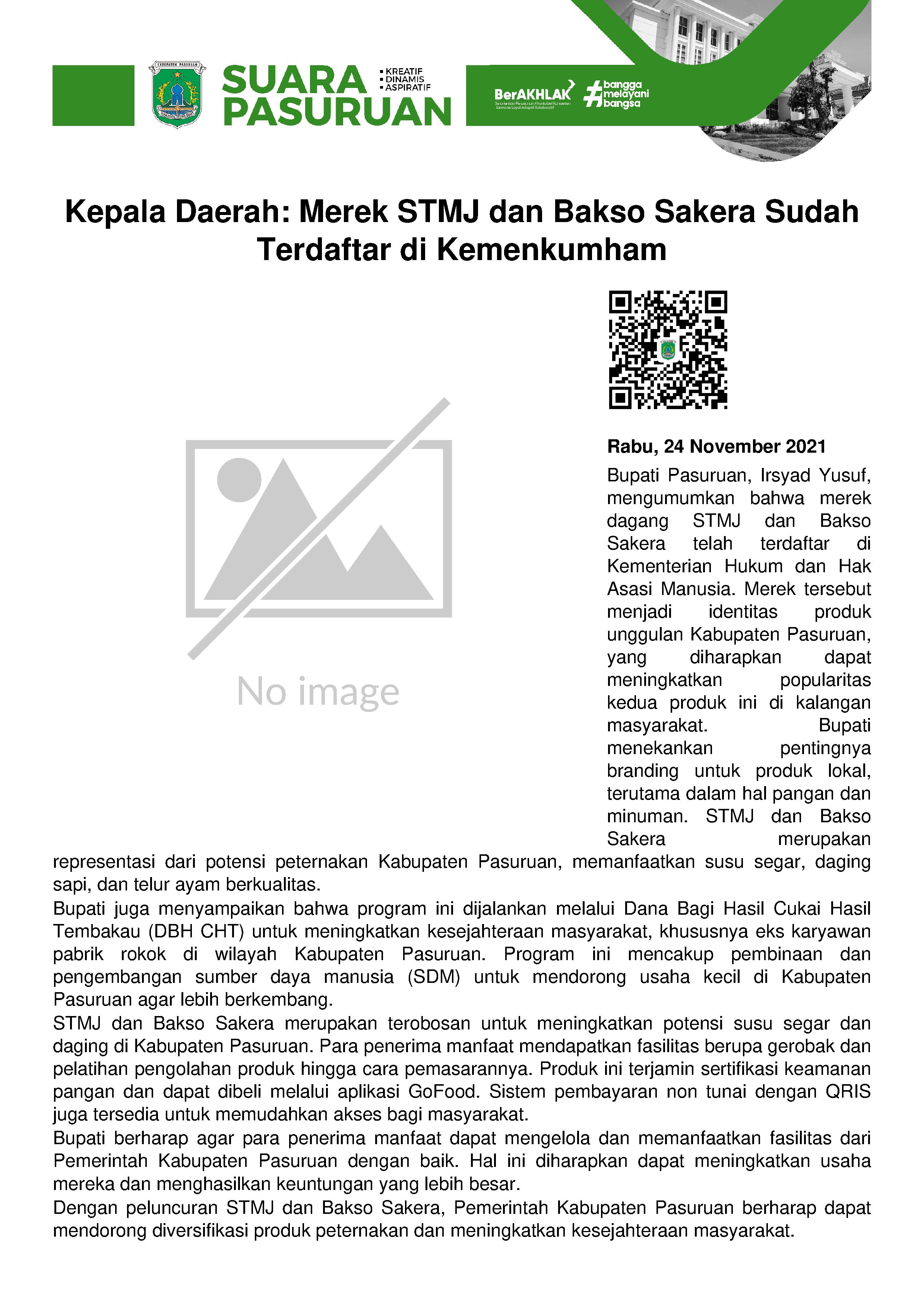 Bupati Pasuruan Irsyad Yusuf menyatakan, baik STMJ maupun Bakso Sakera yang hari ini diresmikan di Pendopo Nyawiji Ngesti Wenganing Gusti telah terdaftar di Direktorat Jenderal Kekayaan Intelektual (DJKI) Kementerian Hukum dan Hak Asasi Manusia (Kemenkumham). Secara branding, merek tersebut telah terdaftar atas nama Pemerintah Kabupaten Pasuruan.