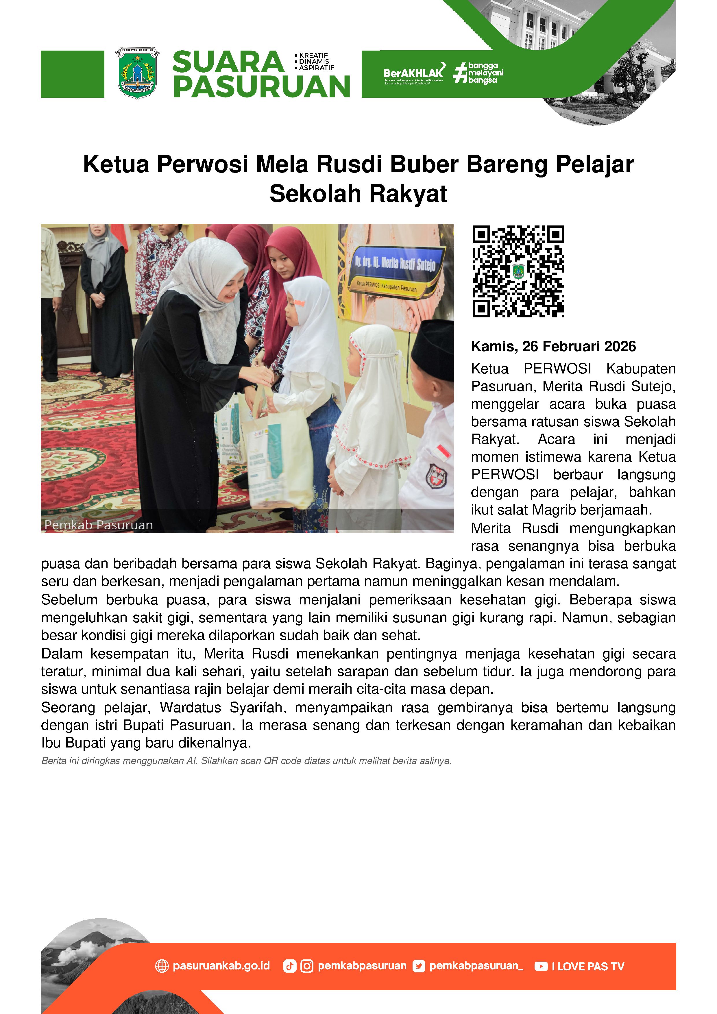 Ketua Persatuan Wanita Olahraga Seluruh Indonesia (PERWOSI) Kabupaten Pasuruan, Merita Rusdi Sutejo berbuka puasa dengan ratusan siswa siswi Sekolah Rakyat Kabupaten Pasuruan, Kamis (26/2/2026).