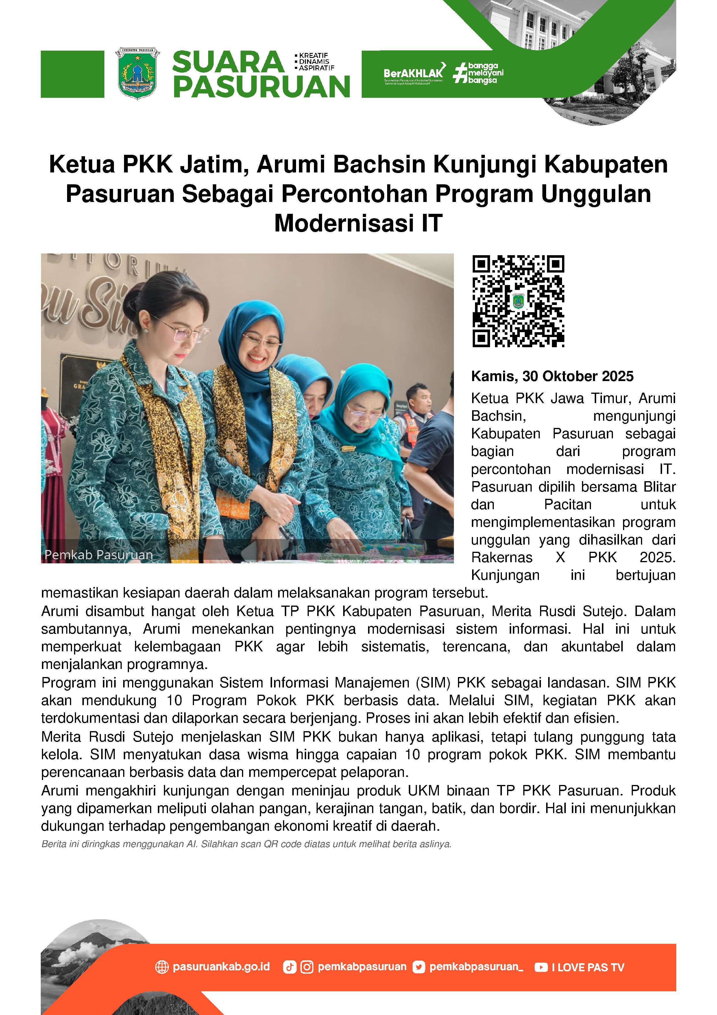 Kabupaten Pasuruan bersama Blitar dan Pacitan menjadi daerah percontohan Jawa Timur untuk pelaksanaan program unggulan modernisasi IT hasil Rakernas X PKK Tahun 2025.
