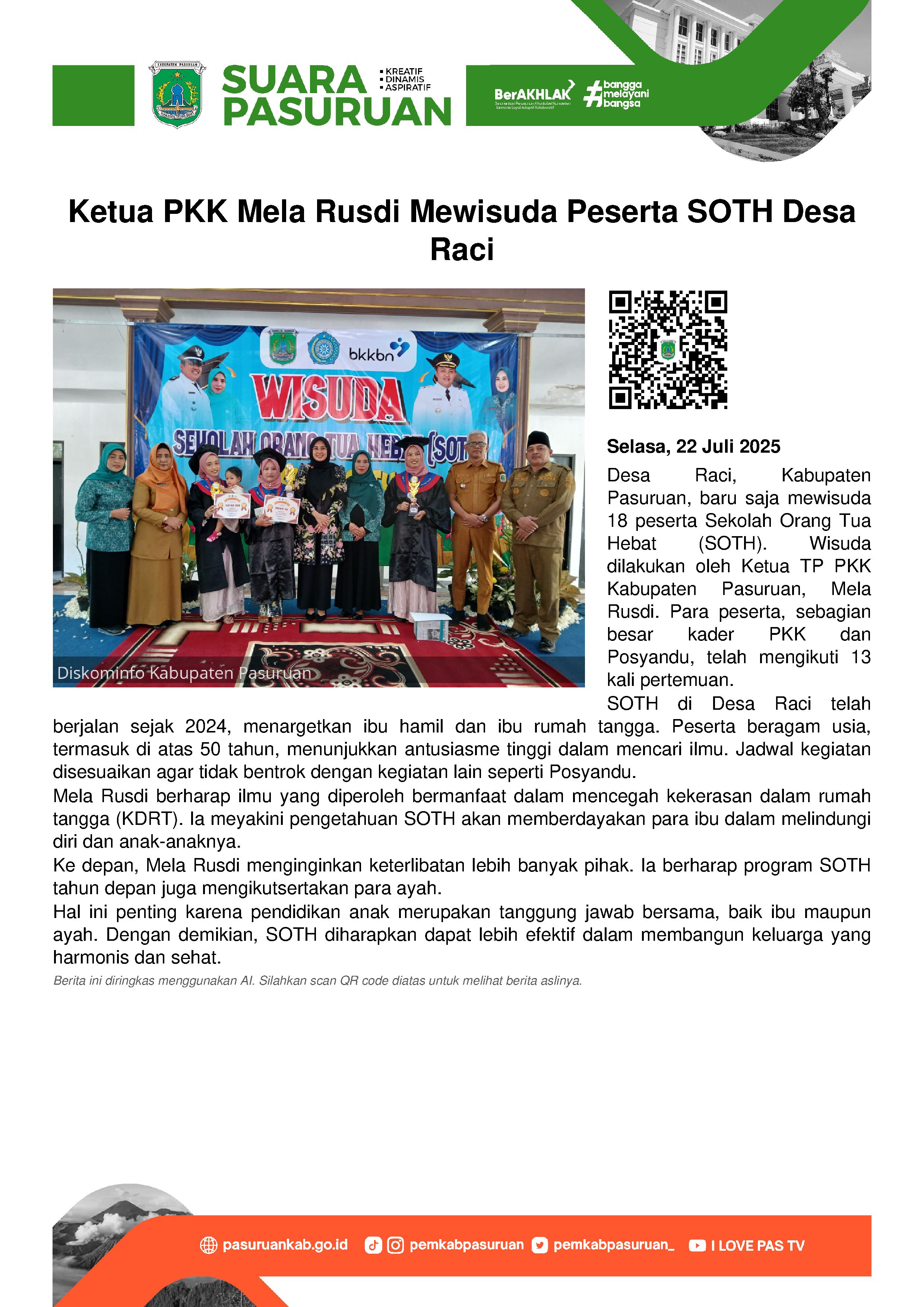 Seperti yang telah dilakukan oleh Pemerintah Desa Raci, Selasa (22/7/2025) pagi. Sebanyak 18 mahasiswi SOTH diwisuda oleh Ketua Tim Penggerak PKK Kabupaten Pasuruan, drg Merita Ariestya Yudi. Mereka adalah para ibu rumah tangga yang sebelumnya telah mengikuti 13 kali pertemuan.