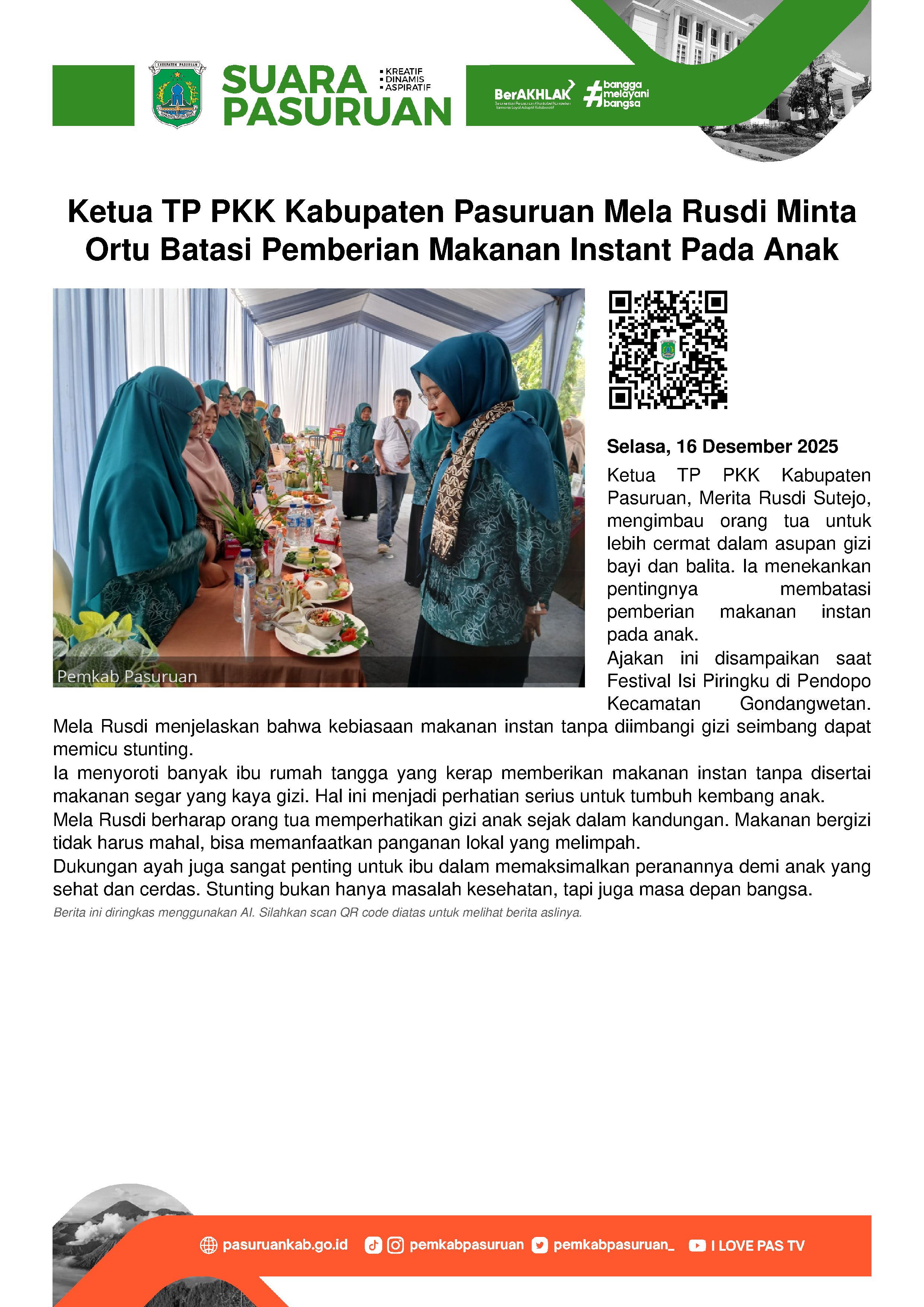 Ketua Tim Penggerak PKK Kabupaten Pasuruan, Merita Rusdi Sutejo mengajak para orang tua agar memperhatikan lebih jeli lagi asupan gizi bagi bayi maupun balita.