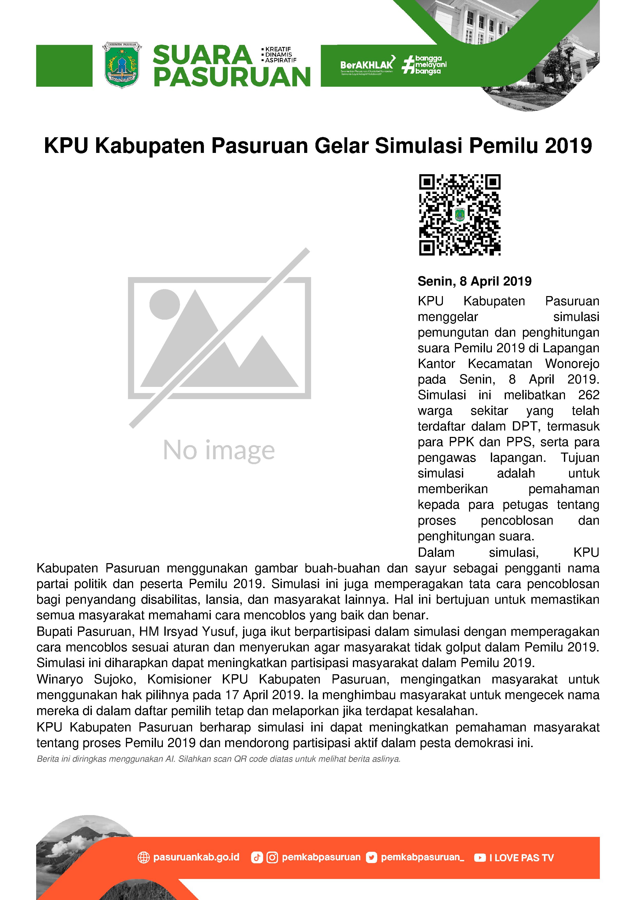 Simulasi tersebut digelar di Lapangan Kantor Kecamatan Wonorejo, Senin (08/04/2019) pagi, dan disaksikan Bupati Pasuruan, HM Irsyad Yusuf, para Komisioner KPU Kabupaten Pasuruan, dan ratusan warga sekitar yang menjadi pelaku simulasi.