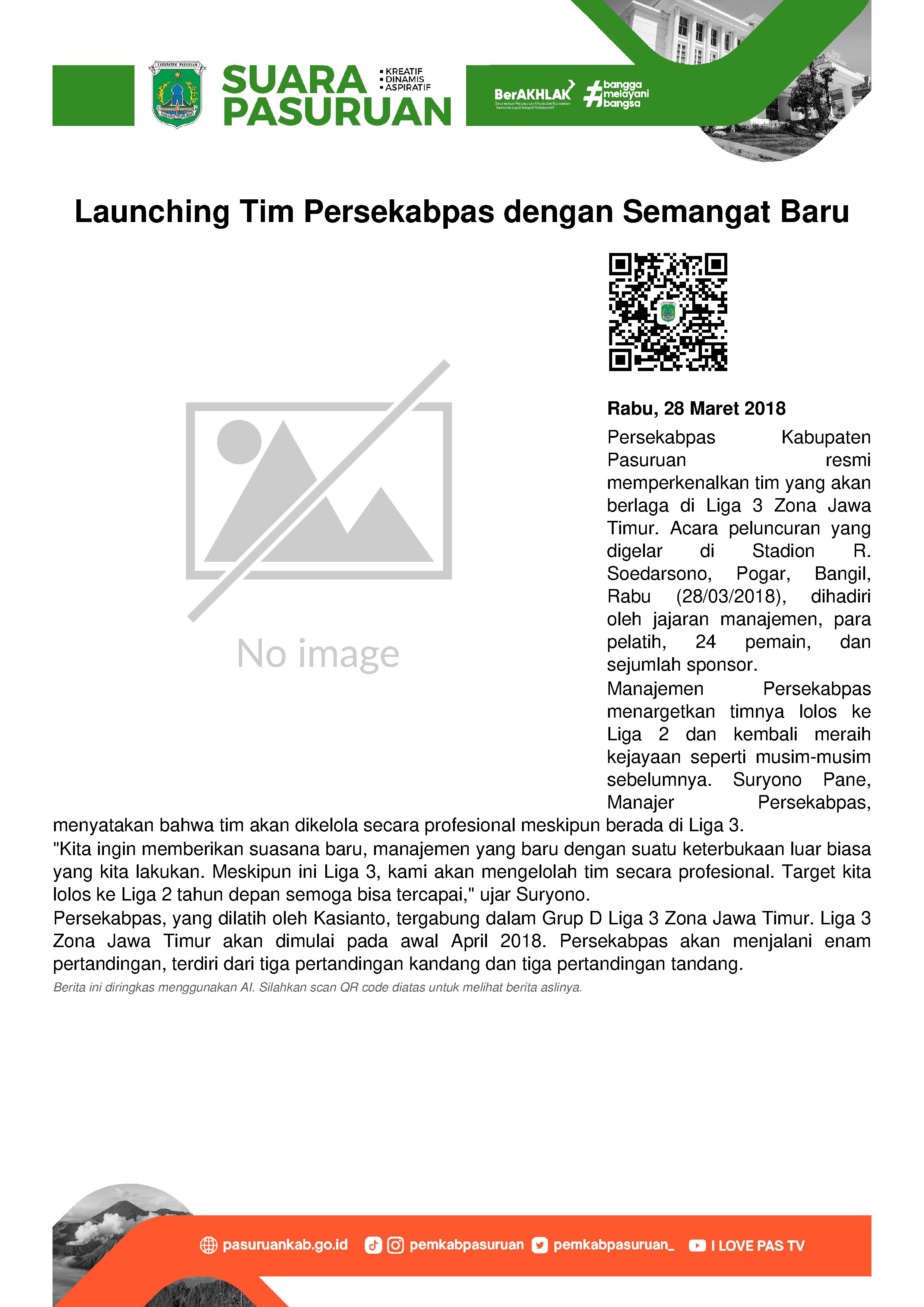 Jelang bergulirnya Liga 3 tahun ini, manajemen Persekabpas Kabupaten Pasuruan memperkenalkan para pemain yang akan mengisi tim berjuluk Laskar Sakera saat mengarungi Liga 3 Zona Jawa Timur di Stadion R. Soedarsono, Pogar, Bangil, Kabupaten Pasuruan, Rabu (28/03/2018) siang.