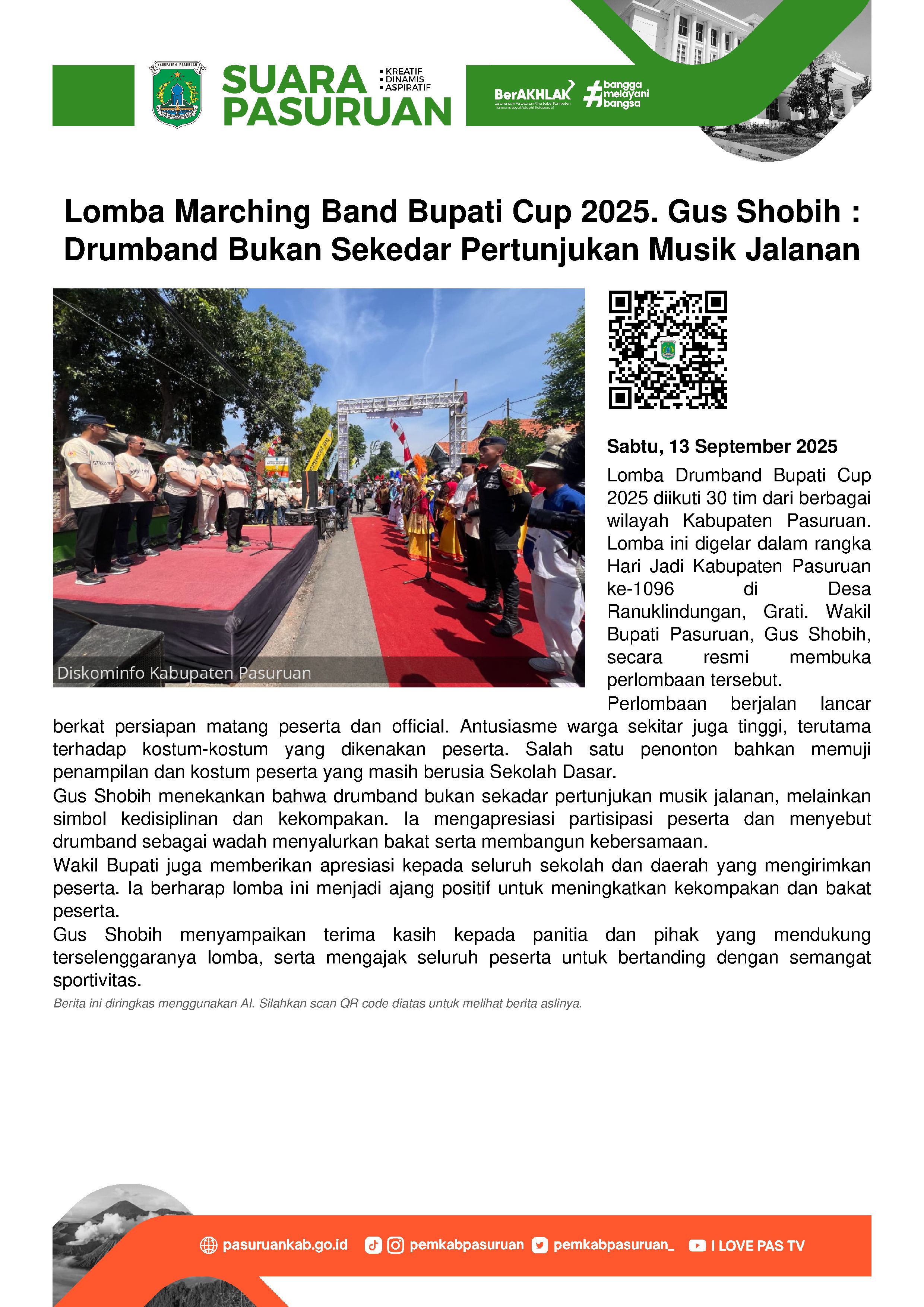 Dalam sambutannya, Gus Shobih - sapaan akrab Wakil Bupati Pasuruan ini mengatakan drumband bukan hanya sekadar seni pertunjukan musik jalanan. Melainkan simbol kedisiplinan, kekompakan, kerja keras, dan semangat juang.