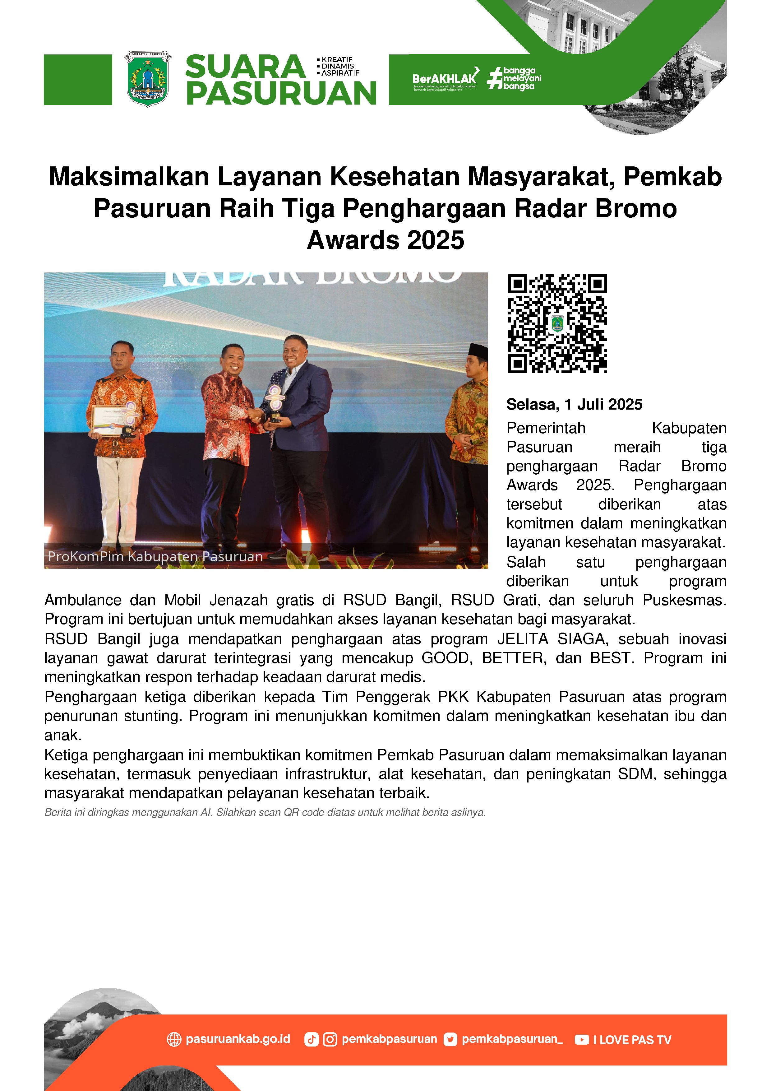Kabupaten Pasuruan kembali meraih tiga penghargaan Radar Bromo Award 2025. Penghargaan pertama yang diraih yakni Program Ambulance dan Mobil Jenazah Gratis, diterapkan di