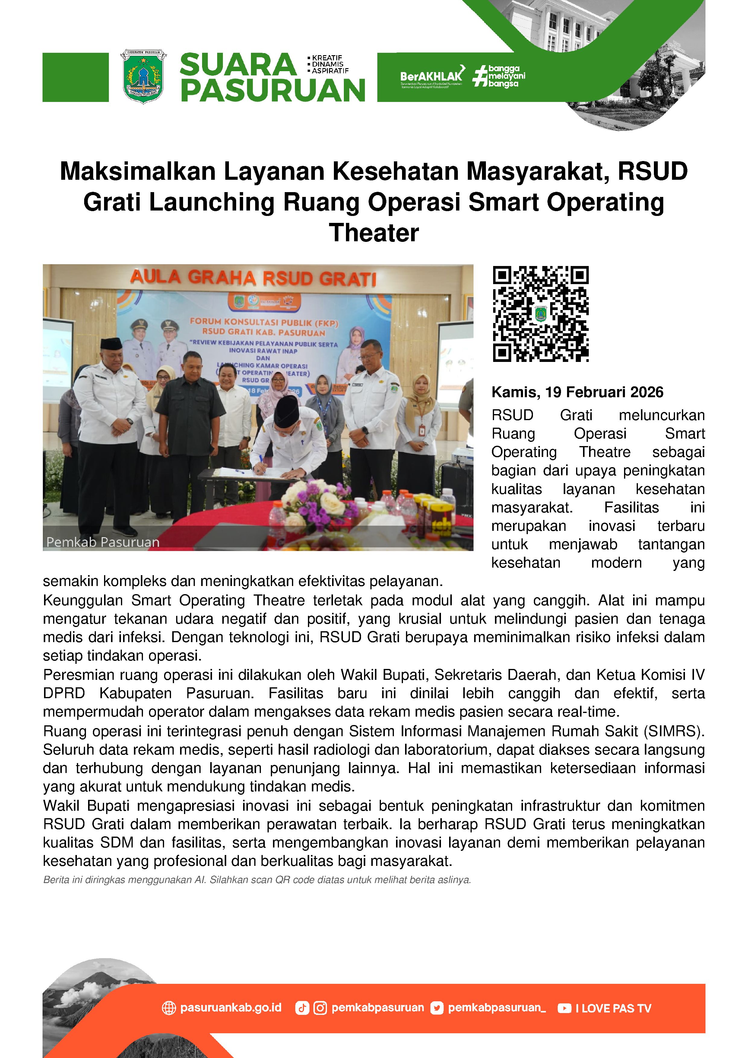 “Alhamdulillah RSUD Grati terus melakukan pengembangan-pengembangan layanan. Seperti yang hari ini kita resmikan bersama, penambahan ruang operasi Smart Operating Theater. Saya mengapresiasi penambahan fasilitas dan inovasi yang terus diupayakan bersama,” tuturnya pada hari Rabu (18/2/2026).