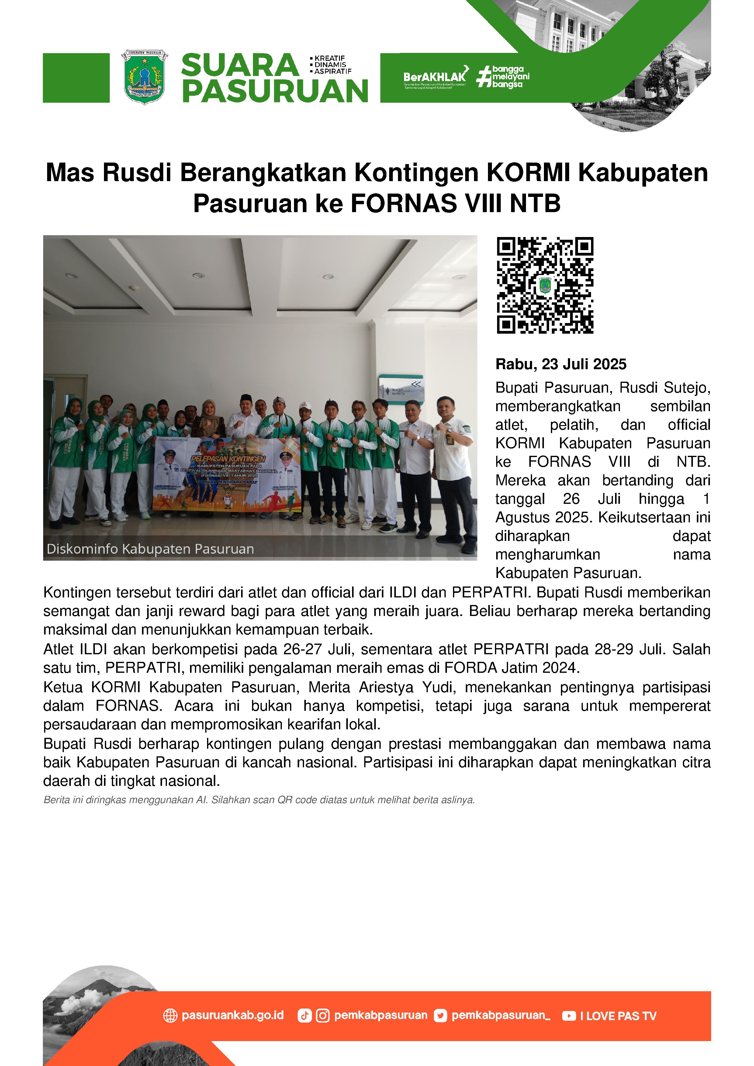 Bupati Pasuruan, Rusdi Sutejo memberangkatkan 9 orang atlet, pelatih dan official Komite Olahraga Masyarakat Indonesia (KORMI) Kabupaten Pasuruan untuk mengikuti Festival Olahraga Masyarakat Nasional (FORNAS) VIII Tahun 2025 yang akan digelar di Provinsi Nusa Tenggara Barat (NTB) pada 26 Juli hingga 1 Agustus 2025 mendatang.