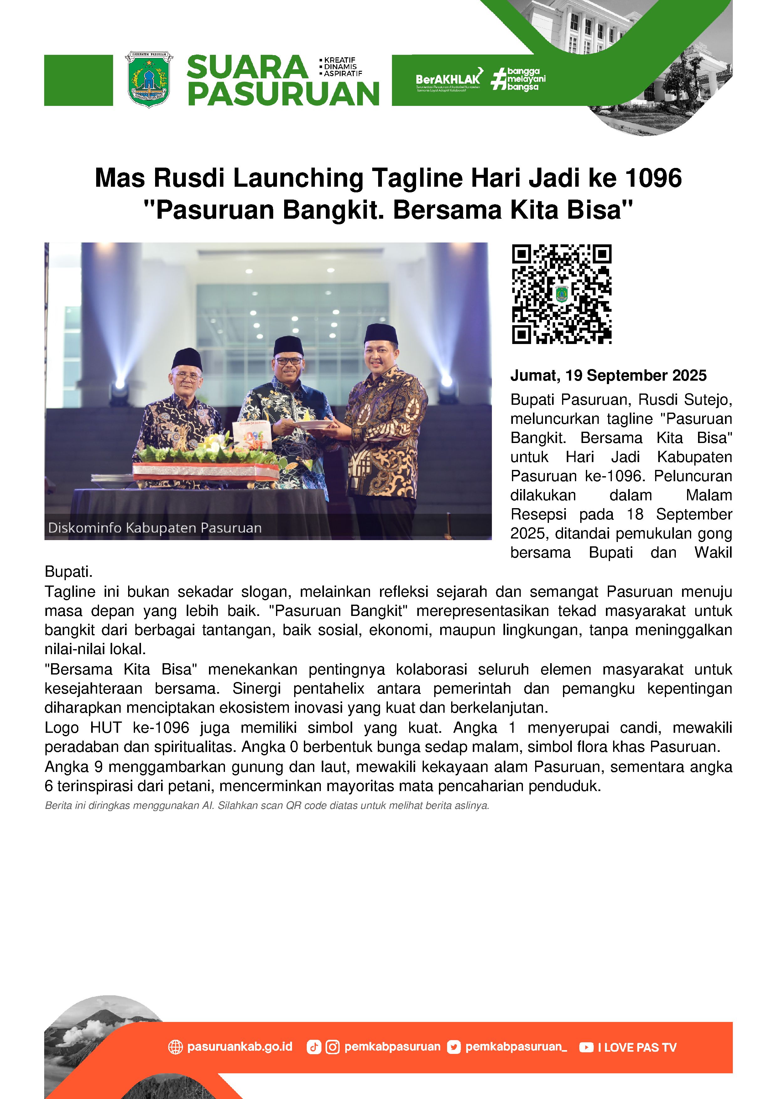 Launching tagline tersebut dilakukan dalam Malam Resepsi Hari Jadi Kabupaten Pasuruan ke 1096, Kamis (18/9/2025) malam dengan ditandai pemukulan gong bersama-sama oleh Bupati Rusdi dan Wakil Bupati, Gus Shobih.