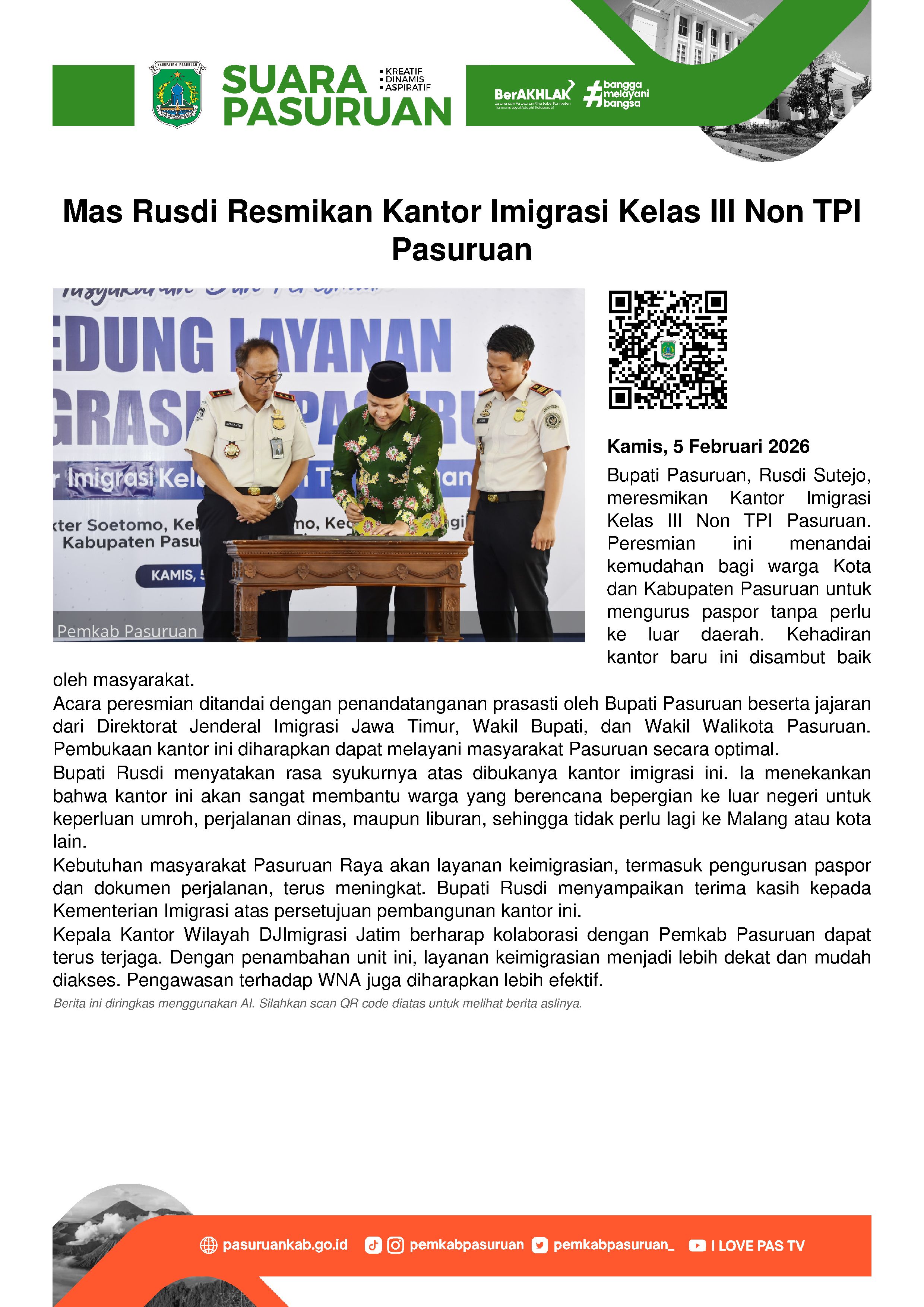 Pasalnya, Kantor Imigrasi Kelas III Non TPI Pasuruan kini hadir di Kabupaten Pasuruan dan secara resmi dibuka oleh Bupati Pasuruan, Rusdi Sutejo, Kamis (5/2/2026).