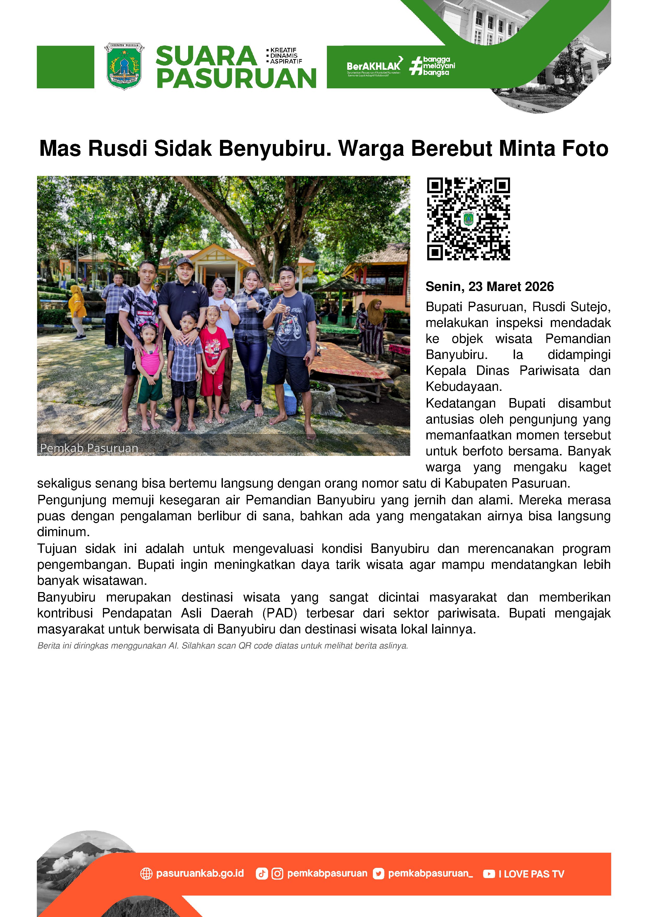 Kepada seluruh masyarakat, Mas Rusdi mengajak untuk beramai-ramai mengunjungi Banyubiru dan semua tempat wisata yang dikelola Pemkab Pasuruan.