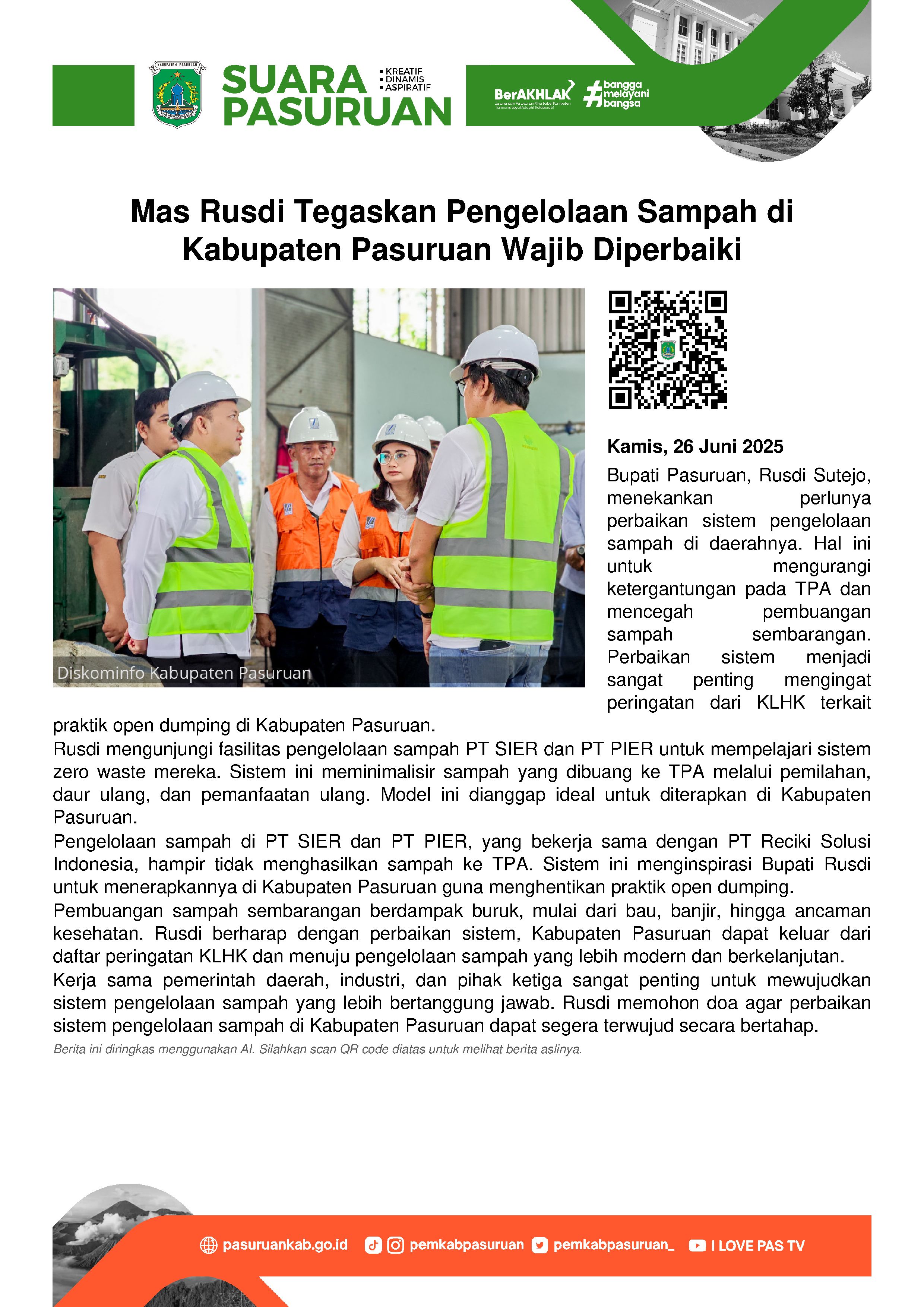 Nantinya, apabila dilakukan, Mas Rusdi meyakini Kabupaten Pasuruan dapat keluar dari daftar peringatan KLHK dan mewujudkan pengelolaan sampah yang lebih modern dan berkelanjutan.