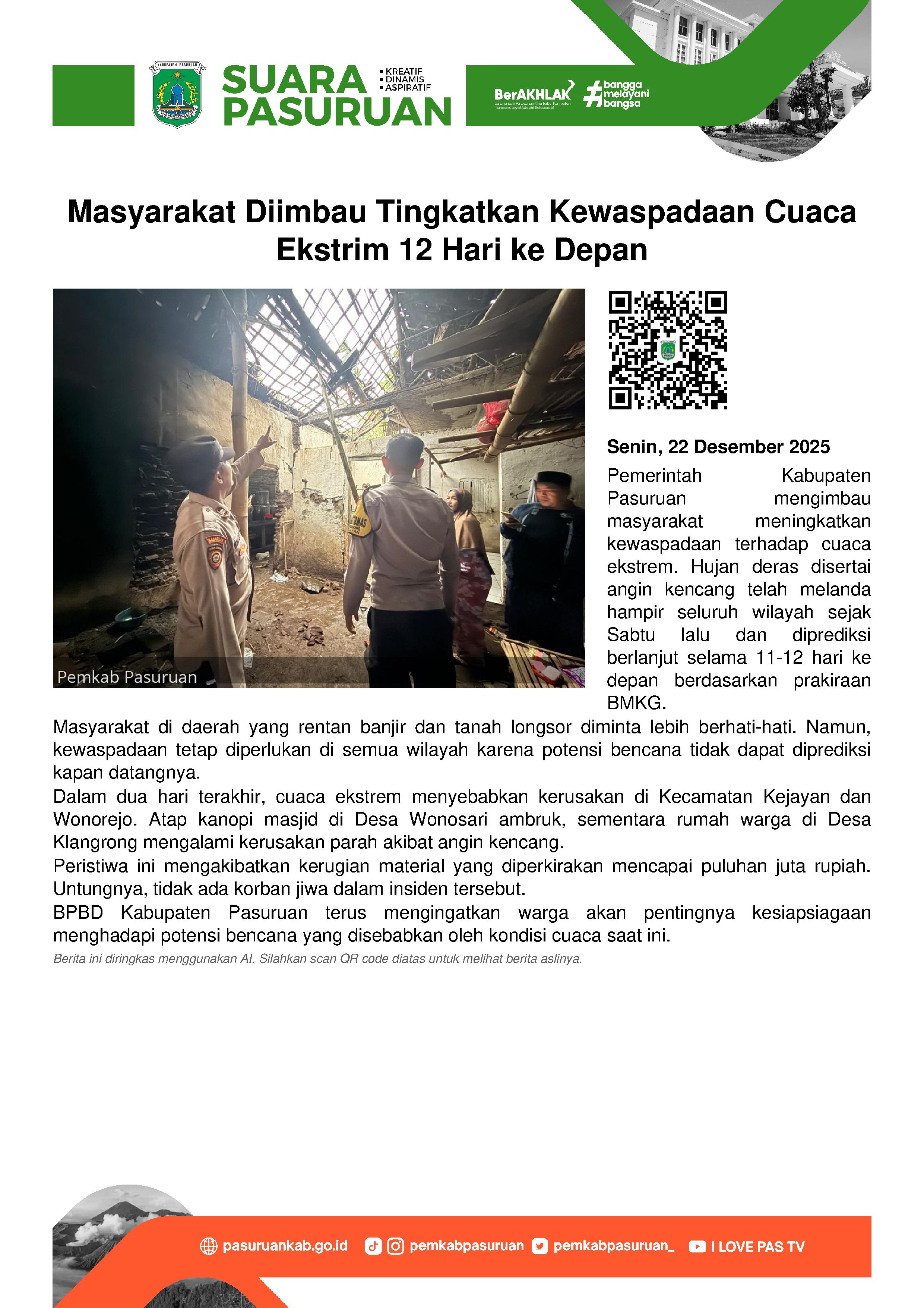 Pemerintah Kabupaten Pasuruan terus mengimbau masyarakat agar meningkatkan kewaspadaan akan cuaca ekstrim yang terjadi saat ini.