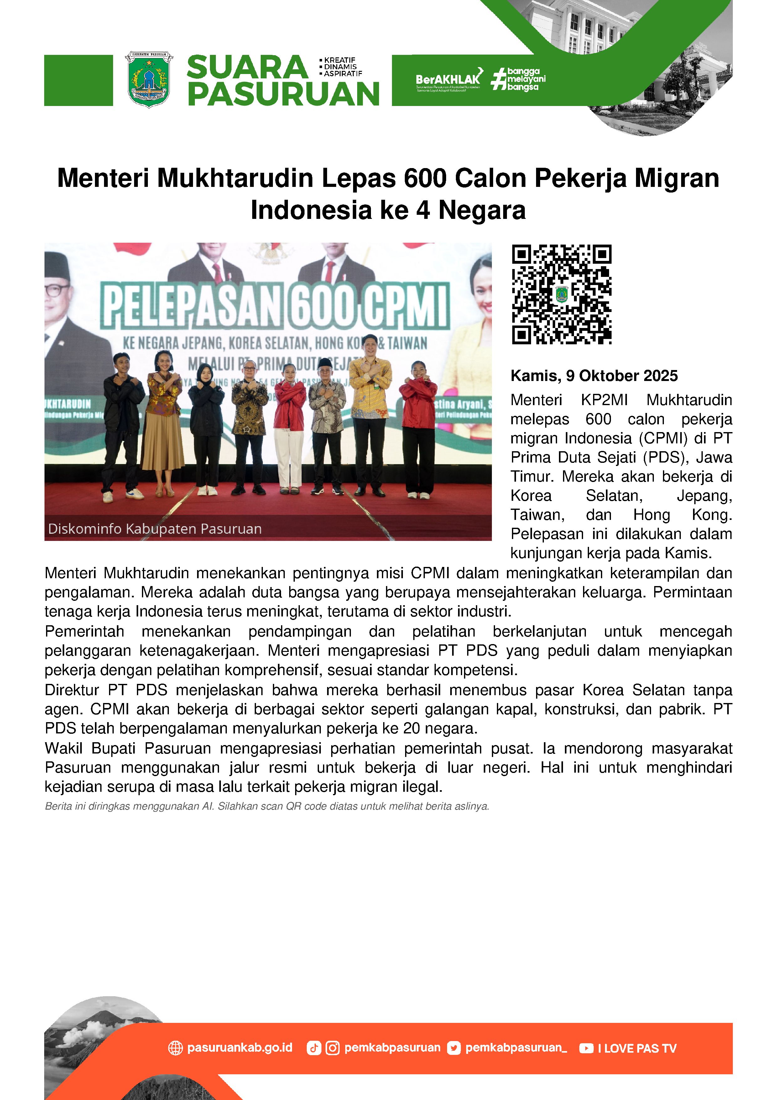 “Dulu Pasuruan dikenal sebagai salah satu daerah pemasok pekerja migran ilegal. Tapi sekarang masyarakat mulai melek, bahwa ada jalur resmi dan lembaga legal seperti PDS yang bisa menyalurkan tenaga kerja ke luar negeri secara bertanggung jawab,” kata Gus Shobih.